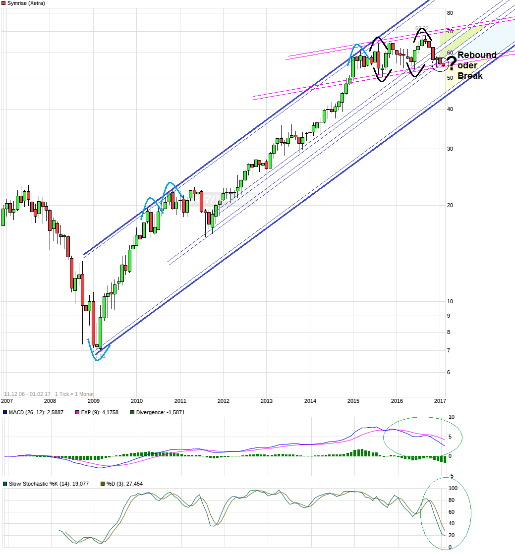Aufwärtstrendkanal der letzten beiden Jahrebleiben will, dann sollte man den jüngsten Reboundversuch möglichst weiter fortsetzen und nicht mehr unter 54 zurückfallen. CEO Bertram hat zudem letzte Woche seinen Vertrag vorzeitig um 5 Jahre verlängert. ( =>http://www.ariva.de/news/...se-vorstandschef-bertram-bis-2022-5972778 ".... Der Vertrag laufe um weitere fünf Jahre bis 2022, teilte das Unternehmen am Mittwoch in Holzminden mit. Symrise habe sich unter Bertrams Führung maßgeblich weiterentwickelt, er habe das Portfolio geschärft und neue Marktfelder identifiziert, hieß es. Mit der Bestätigung Bertrams als Vorstandsvorsitzenden sei die Basis für weiteres profitables Wachstum geschaffen...") Somit ist von der Personalseite her auch für längere Zeit keine Unruhe zu erwarten, sondern gewohnte Qualität. Schauen wir mal, ob die Börse das würdigt oder ob man die Konso der letzten Monate doch fortsetzen will.