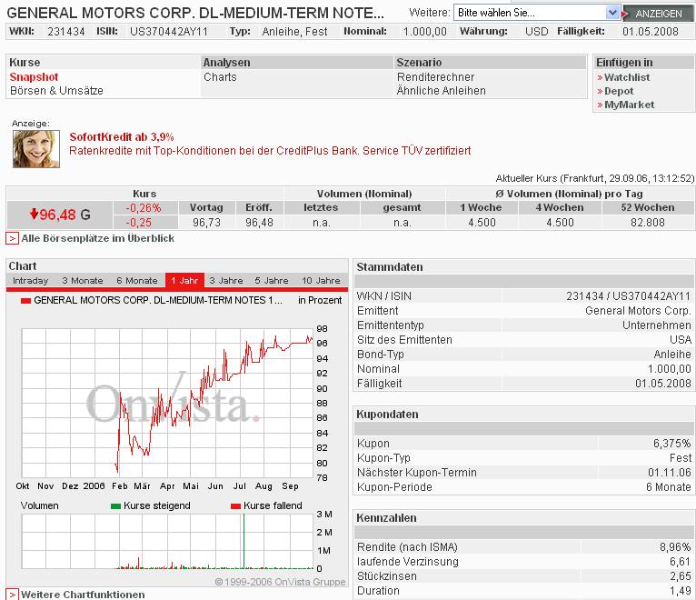 Die kürzesten EUR bzw USD Anleihen auf GM laufen derzeit bis 05/06 2008 (z.B. 231434). Der Kurs liegt bei 96,48, war aber auch schon mal unter 80 (da hätte man kaufen müssen). Immerhin liegt die jetzige Rendite bei 8,96% - nicht schlecht, wenn man nur wüßte, ob GM im Mai 2008 auch fristgerecht tilgt.