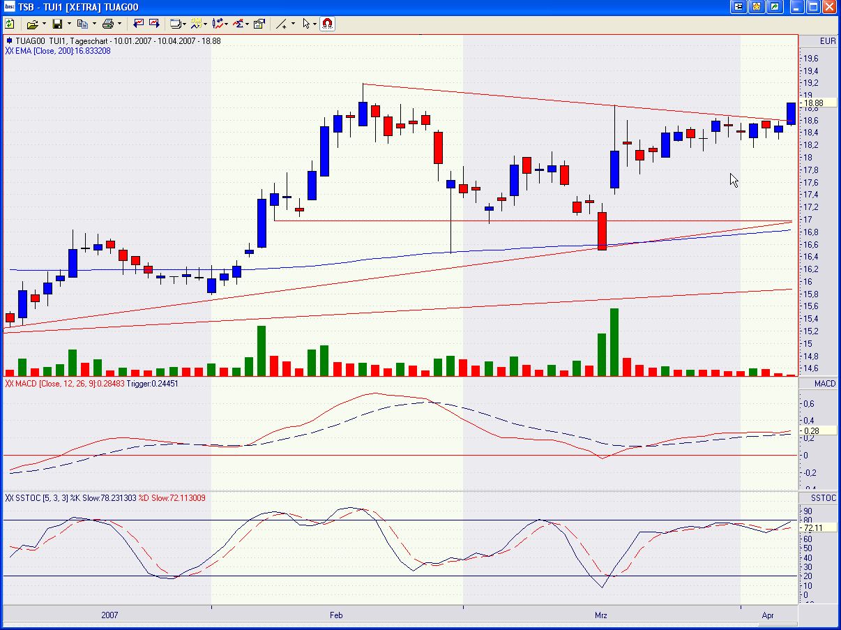 Rückblick: Die TUI Aktie fiel ab August 2005, nachdem sie am Widerstand bei 22,3 Euro gescheitert war, stark ab. Erst ein Jahr später markierte sie ein Tief bei 14,01 Euro. Dieses Tief war Ausgangspunkt einer Rallye, die noch immer anhält. Diese Bewegung lief bisher in einem Trendkanal ab. In der laufenden Woche etabliert sich die Aktie zum einen über dem wichtigen Widerstand bei 18,45 Euro. Dort verläuft der Sell Trigger, dessen Unterschreiten die deutliche 1jährige Abwärtsbewegung, ausgelöst hatte. Zudem attackiert die Aktie sogar die obere Begrenzung der Aufwärtsbewegung seit August, welche bei 19,59 Euro verläuft.