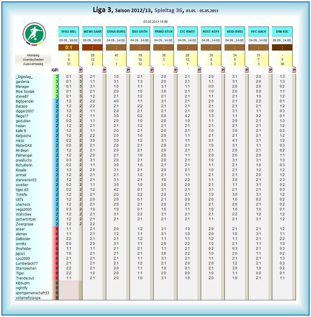 nun auch auf Tagessiegkurs gehen, per Unentschieden... endet es 2:2 wäre fliege77 sogar alleinigst Tagessieger.. bleibts 1:1 dann MisterDAX und fliege77.. gewinnt BVB2 dann 1:2 wäre Tiger Tagessiger, jeglicher anderer Sieg Dortmunds würde Tiger und MisterDAX Tagessieger sein lasse.... gewinnt Babelsberg ist MisterDAX klar der Tagessieger.. :-)))