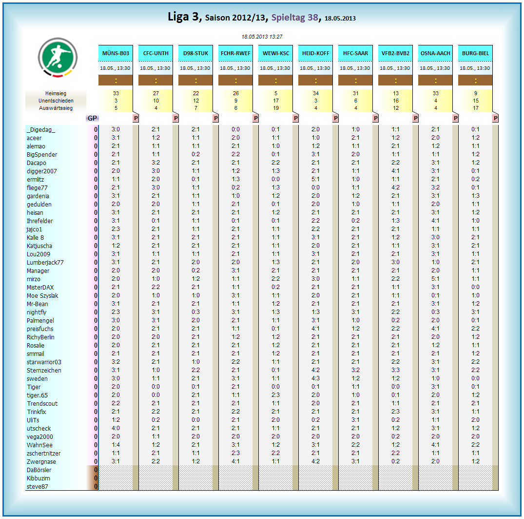 Wer wird Dritter und geht in die Aufstiegsrelegation? Heidenheim geht von der Pole Position ins Rennen und hat mit dem OFC eine machbare Aufgabe vor der Brust. Osnabrück und Münster hoffen auf einen Patzer. Die Preußen haben es mit Babelsberg zu tun, das in den Abstiegskampf involviert ist. Und der ist völlig offen! Darmstadt und die Stuttgarter Kickers treffen direkt aufeinander, der BVB II muss zum VfB II. Nur die Filmstädter haben es nicht mehr in der eigenen Hand. Derweil geht es für den KSC und Bielefeld noch um die Meisterschaft.