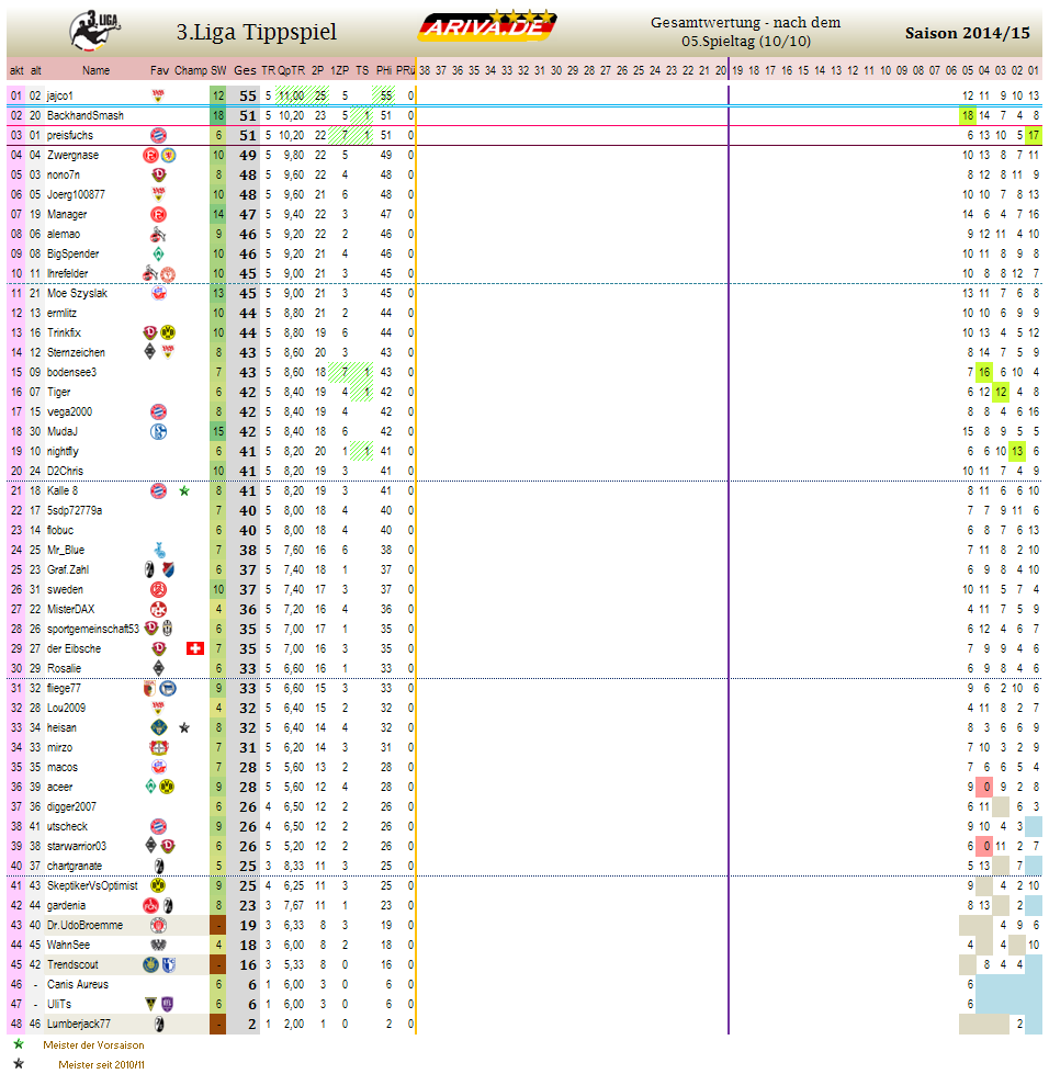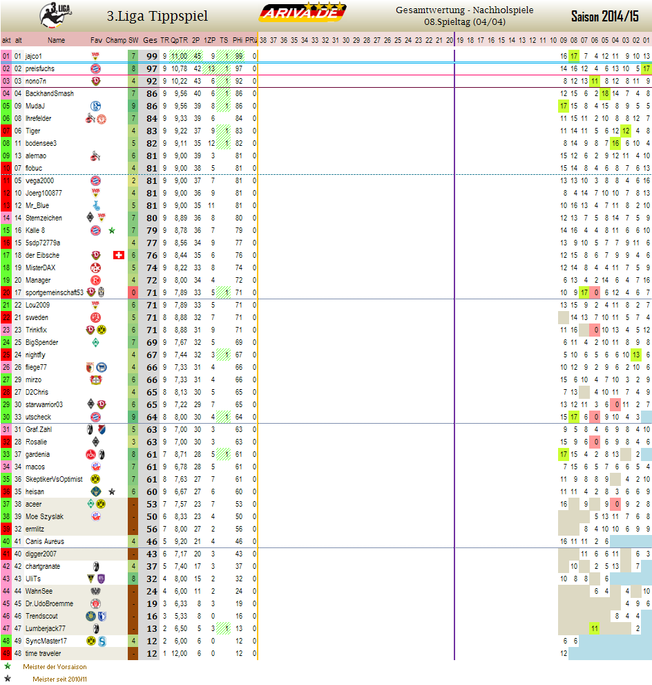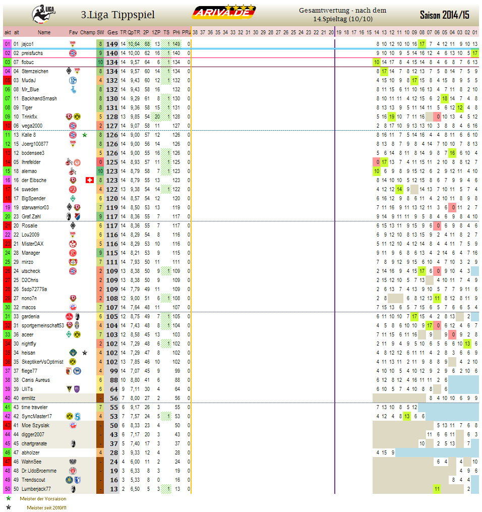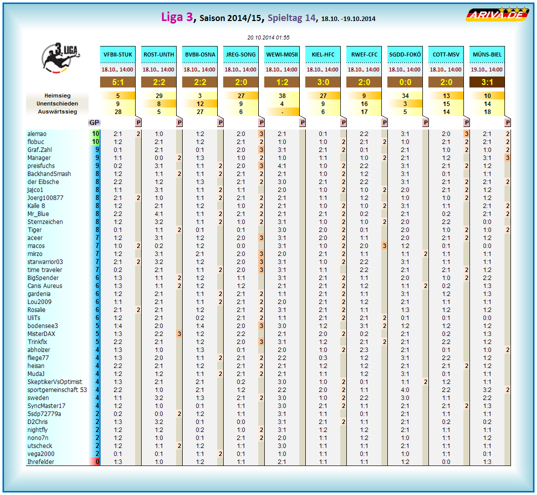 2) Die Spieltage 8 und 9 haben sich überschnitten! Die Gesamtwertung am Ende dieses Beitrages ist somit auf dem neuesten Stand! Weitere Infos zum 8. Spieltag (gestern beendet) findet ihr hier: http://www.ariva.de/forum/3Liga-Tippspiel-2014-15-Spieltag-08-506845
