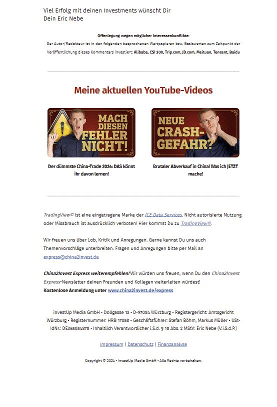 Ich bin Eric Nebe und lebe derzeit im Reich der Mitte. Meine langjährige Erfahrung in der Finanzwelt und meine tiefe Verbundenheit mit China ermöglichen es mir, authentische Einblicke in Investitionsmöglichkeiten in die chinesische Wirtschaft zu geben. Neben meiner beruflichen Tätigkeit betreibe ich erfolgreich den YouTube-Kanal China2Invest sowie den Podcast China Calling, in denen ich mein Wissen über die chinesische Wirtschaft und Kultur teile.