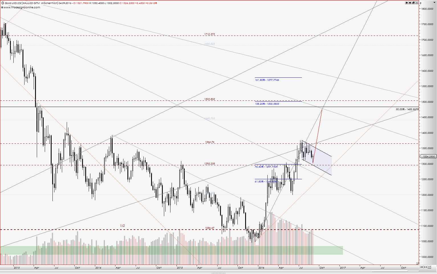 Aus der Bullenflagge ergibt sich Kursziel bei mind. 1470-1480. Bei 1500 liegen zum 3/4 Gann Linie und 138,20 Fibo.