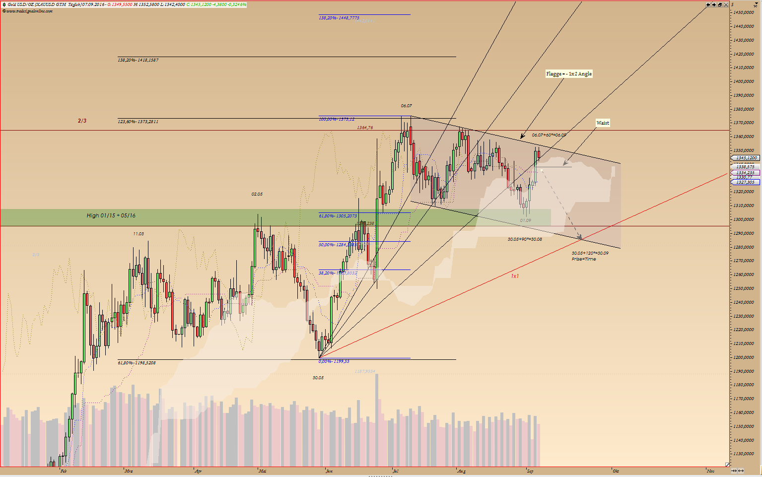 Im weiteren Verlauf kann nach unten noch Waist eine Unterstützung bieten. Wird dieser gebrochen, werden die Kurse, denke ich auf die 1x1 Angle nach unten zu steuern. Das ganze müsste dann bis zum 30.09 abgeschloßen sein, dann ist dort Zeit und Preis ausgegliechen.