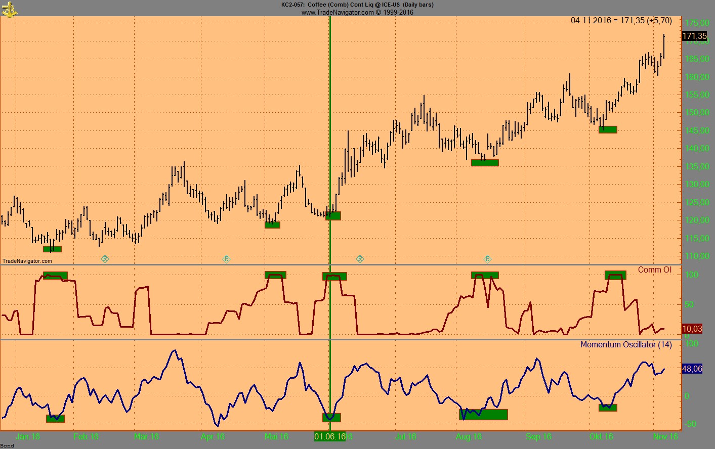 Der Momentum Indikator brach die Downline und war am 1.7 positiv, bei Commindex auf 100.