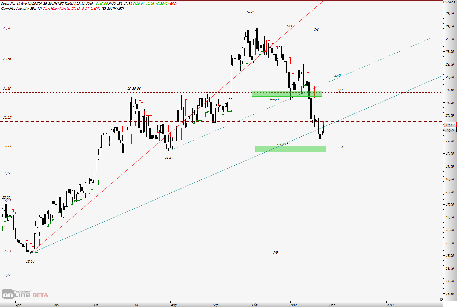 Zucker wird vielleicht interesanter Kandidat. Aufwärtspotenzial ist bei weitem noch nicht ausgeschöpft... aber auch zunächst noch Seitwärts zw. 19 und 21. Heutige Kerze ist noch nicht auf dem Shart, aber es steuert auf die 19 zu (März 17 Kontrakt)