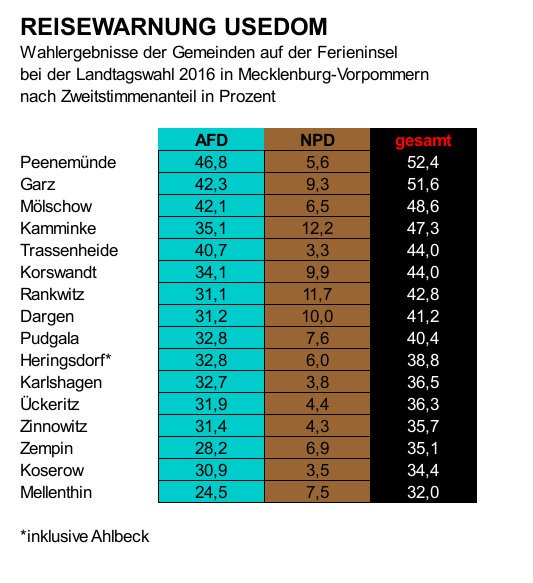 Bei uns NPD Wähler in freier Wildbahn anzutreffen ist fast möglich (letzte LTW < 1%). Die schlappen 12,5% AfD Wähler trifft man auch eher selten - für die hat man im braunen Usedom nur ein müdes Lächeln über.