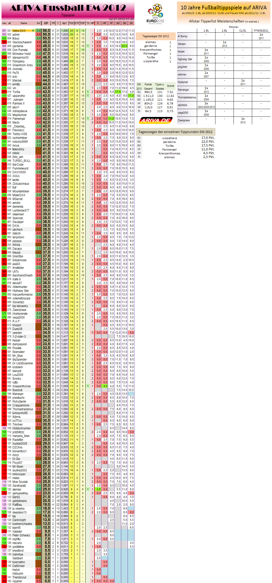 Seit dem 2:0 ist Xetra-DAX offizieller TippMeister des EM2012 Tippspieles!! Das ist nun zu 100% dingfest.. selbst wenn jetzt Italien noch 3:2 gewinnen würde.. admin bekäme nur +2,5 Xetra Dax 0, aber der Vorsprung von Xetra-DAX beträgt 3,5 Punkte.. also alles aus!