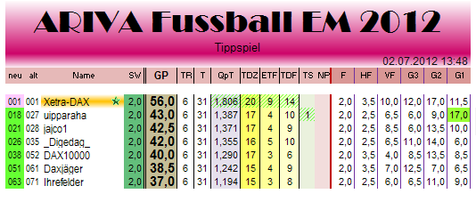 So an sich hat Xetra-DAX mit die meisten richtigen Tendenzen, hat die meisten Ergebnisse getroffen und die meisten Punkte durch Tordifferenzen eingeheimst...