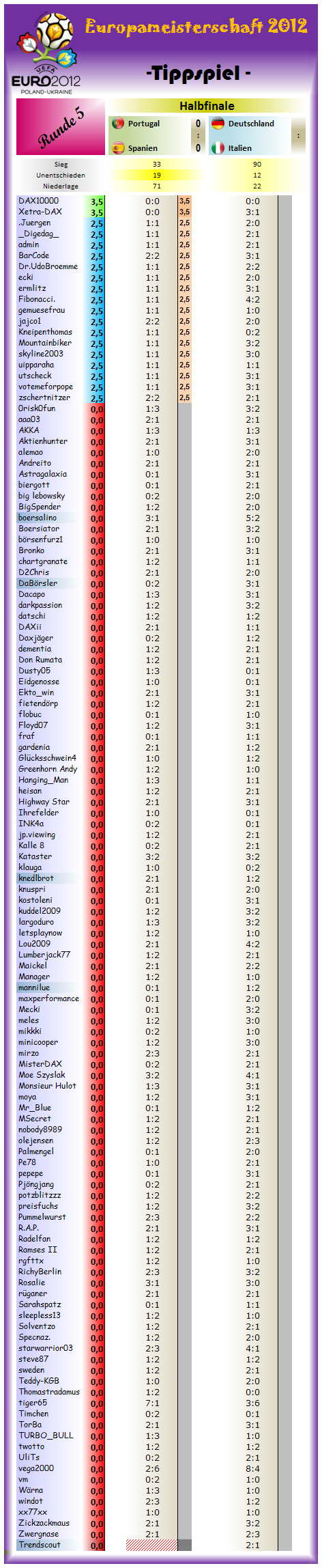 lassen wir uns überraschen.. Jedenfalls sieht man aber - sind nur 2 Spiele, aber die Top 10 sind kunterbunt beim tippen.. Also Kampf ist noch vorprogrammiert.. Und sollte gar Portugal gewinnen, dann wirds mehr als eng in den Top 10.. dann knistert es nochmal richtig.. Gewinnt Spanien, wird der Kreis der Meisterschaftsfavoriten noch kleiner, dann haben nur noch knapp 5-6 Tipper die Chancen auf den Titel..