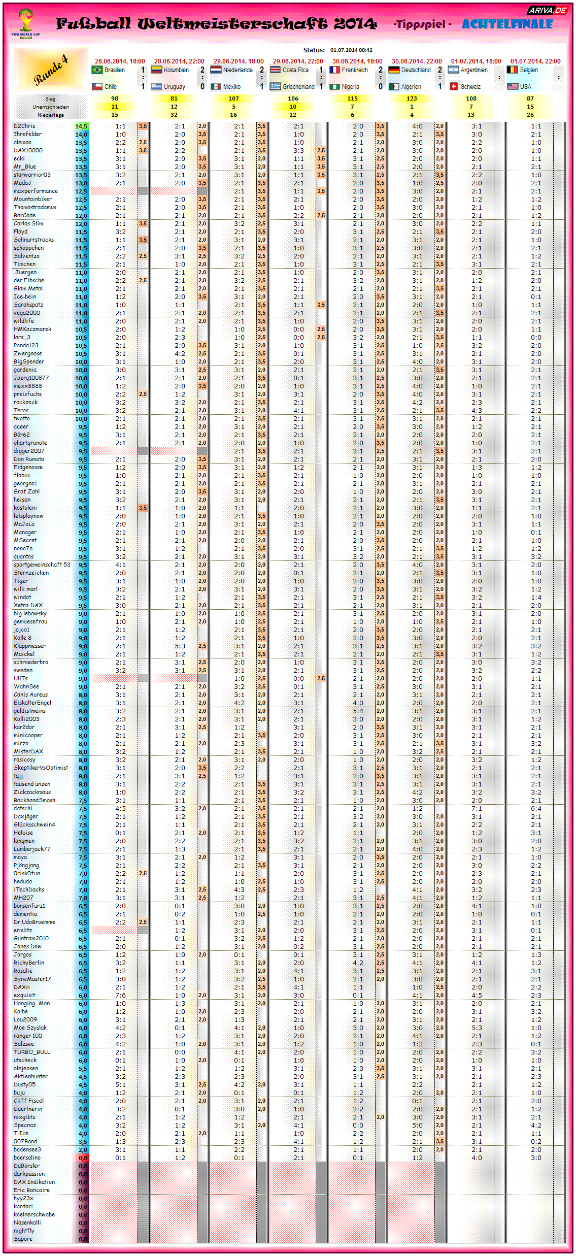Gespielt wird Tipprunde 4 , die Achtelfinalspiele der WM2014, vom Samstag, den 28.06.2014, ab 18:00 bis Dienstag, den 01.07.2014, ab 22:00!!