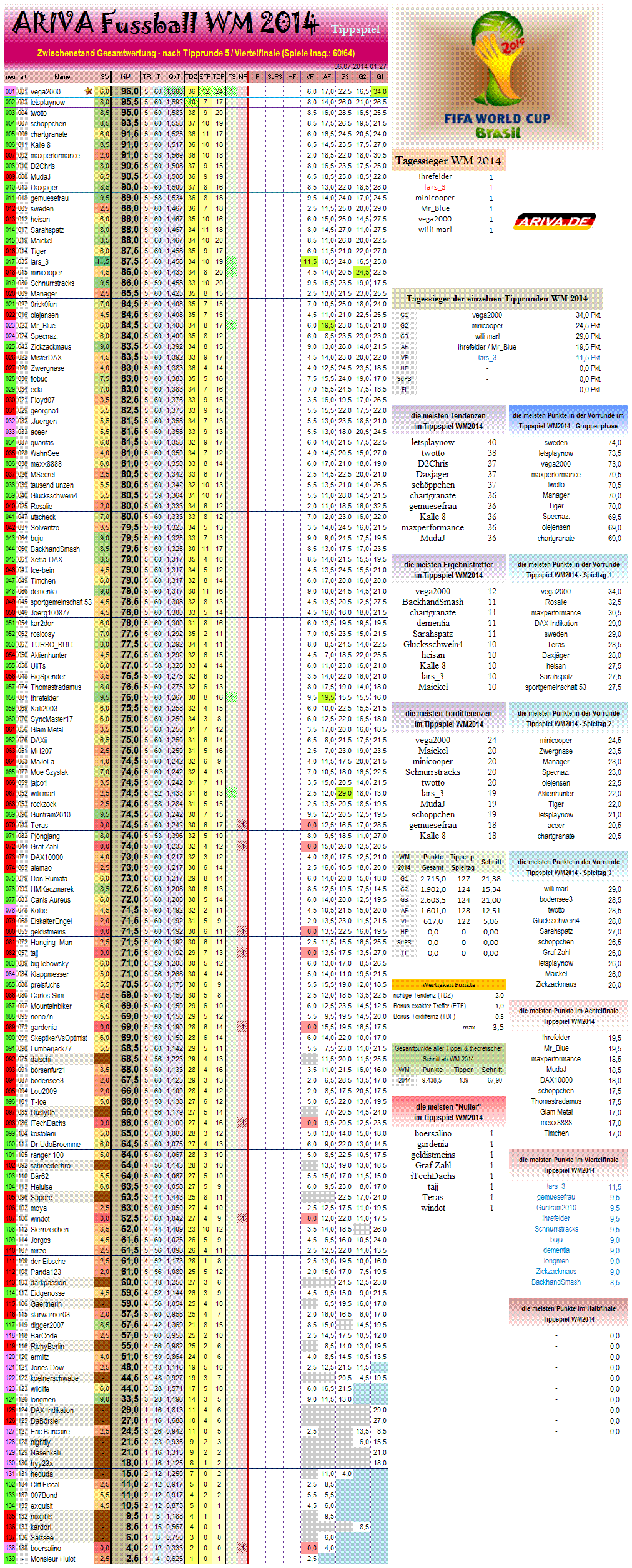 hier nun die abschließende Tageswertung zur Tipprunde 5 / dem Viertelfinale der WM 2014 in der Übersicht...