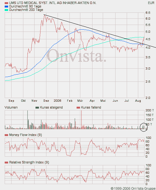 „Ein sattes Kursplus von 27% auf Vierwochensicht weist momentan der Medizintechnikkonzern United Medical Systems, kurz UMS, auf. Hintergrund ist die Ankündigung, nun auch noch das restliche Europageschäft zu verkaufen, um sich künftig ganz auf das Geschäft in Nord- und Südamerika zu konzentrieren. Denn anders als das Europageschäft ist das sehr wachstumsstark und vor allem hochprofitabel: Im ersten Halbjahr 2006 steigerten die fortgeführten Aktivitäten in Nord- und Südamerika ihren Umsatz um 24% auf 18,2 Mio. Euro und erwirtschafteten eine Nettomarge von stolzen 22%. Und künftig wird die Marge noch weiter steigen können, weil sich das Unternehmen mit dem abschließenden Verkauf des Europageschäfts noch weiter entschulden wird. Zum ersten Halbjahr ist die Eigenkapitalquote durch die schon abgewickelten Spartenverkäufe bereits von 31 auf 36% gestiegen. Ist der Konzernumbau erst einmal abgeschlossen, was bis Ende 2006 der Fall sein soll, verspricht der Konzern eine EK-Quote von „weit über 40%“. Da die fortgeführten Aktivitäten im Gesamtjahr auf rund 40 Mio. Euro Umsatz kommen dürften und UMS an der Börse nach wie vor nur 29 Mio. Euro wert ist, verheißt das mittelfristig weiter Potential für den Aktienkurs. Denn bei hoher Nettomarge nach dem Konzernumbau und anhaltend zweistelligem Umsatzwachstum sollte der faire Wert des Unternehmens in Richtung eines Kurs-Umsatz-Verhältnisses von 1 oder gar darüber gehen“, so Simon Betschinger im TradeCentre.