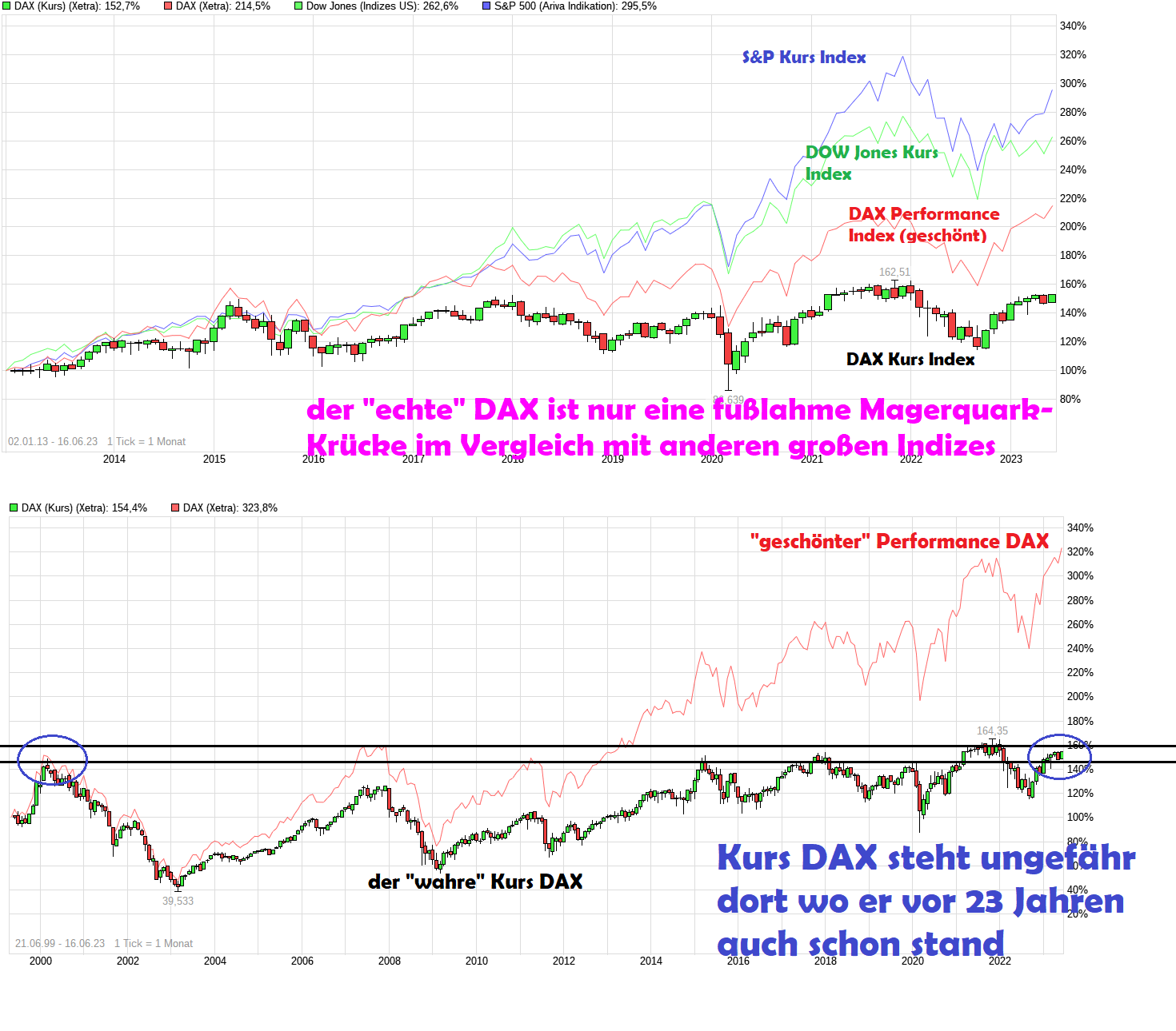 In der ganzen Welt sind die großen Indizes vernünftigerweise Kurs Indizes und nicht "beschönigende" Performance Indizes. Da könnte der Perf. DAX sogar theoretisch in einem Jahr steigen, wenn parallel die Aktienkurse in der Summe sinken, solange die Divis höher sind als die Kursrückgänge. Von daher müßte man auch bei Vergleichen von Einzelwerten mit dem Performance-DAX auch jedesmal alle in der Vergangenheit ausgeschütteten Divis zum Kurs des Einzelwertes hinzurechnen oder besser gleich den Kurs Index als Vergleich im Chart anzeigen lassen. Wenn man sich mal anschaut wo der Kurs-DAX zur Jahrtausendwende stand und wo aktuell und dann noch die ganze Inflation der letzten Jahrzehnte bedenkt, dann ist das Ganze eher Blendwerk was in Deutschland die Schrott-Medien den Ahnungslosen jubelnd täglich vor die Nase halten. Aber wer will schon in der heutigen Zeit aufgeklärte Bürger/Kleinanleger. Die dürftige Entwicklung des Kurs DAX über die Zeit ist ein Zeichen, daß man besser gezielt Sektoren oder Einzelwerte aussucht, die auf Strecke besser als ein Gurken-Index wie der Index DAX laufen. ( „Wahrer“ Dax: Warum der reine Kursindex schlechter performt als solide Staatsanleihen11.04.2023 - https://t3n.de/news/...-dax-kursindex-performance-dividenden-1546389/ )