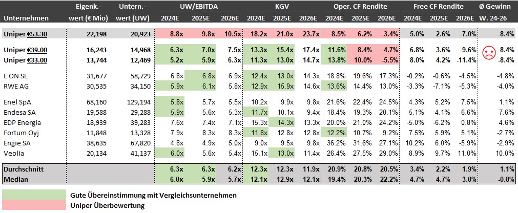 In der Tabelle sieht man, dass bei einem Aktienpreis zwischen EUR 33 und 39, die meisten Multiplikatoren von Uniper mit den Multiplikatoren der Vergleichsunternehmen etwa übereinstimmen. Darum wäre die Uniper Aktie bei EUR 33-39 fair bewertet.