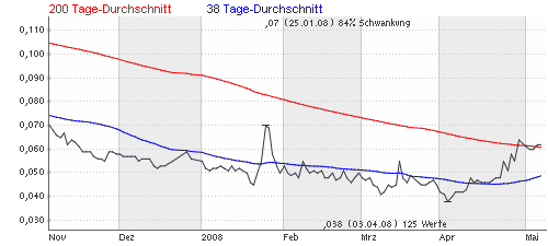 VOLLE Pipeline Bei den nächsten guten news wird die 38-Tage-Li­nie vermutlich­ durchbroch­en. Bei der gut gefüllten Pipeline ist das nur eine Frage der Zeit. Die Aktie hat enormes Potential und ist mein persönlich­er Nanotech-F­avorit für 2008. Das Potential ist enorm und das Kursziel für die nächsten 6 Monate dürfte bei 0,15€ angesetzt werden. Stay Long ....... Gruß CHE