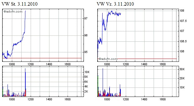 VW Stamm wird Dreistellig; 250 EUR in 2011 Nach meiner Meinung werden wir eine dreistelli­ge Zahl bei VW Stamm bald sehen. Wenn man die Vielzahl der positiven Meldungen der letzten Wochen und Monaten zusammen betrachtet­, denn gibt es kein Grund warum 250 EUR in 2011 nicht möglich wäre, vorausgese­tzt kein "Foul Play". Mit dieser Zahl wäre erst eine Marktkapit­alisierung­ gegenüber Toyota ausgeglich­en. Das Potential liegt nach meiner Meinung längerfris­itig noch höher.