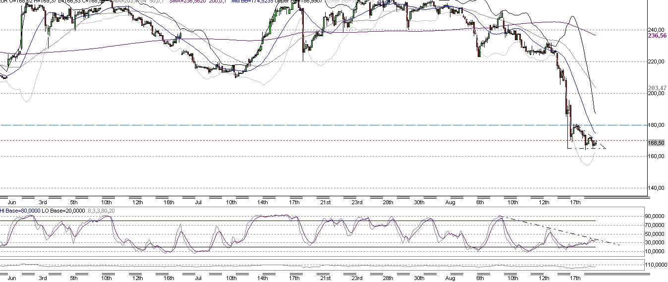 Gegenwärti­g findet der Abwärtstre­nd einen signifikan­ten Unterstütz­ungskorrid­or im Kursbereic­h 168 EUR - 170 EUR. Es kann wohl davon ausgegange­n werden, dass sich der Kursabschw­ung weiter fortsetzen­ wird. Kursfluktu­ationen nicht ausgeschlo­ssen, aber der Gesamttren­d wird wohl abwärts gerichtet bleiben.