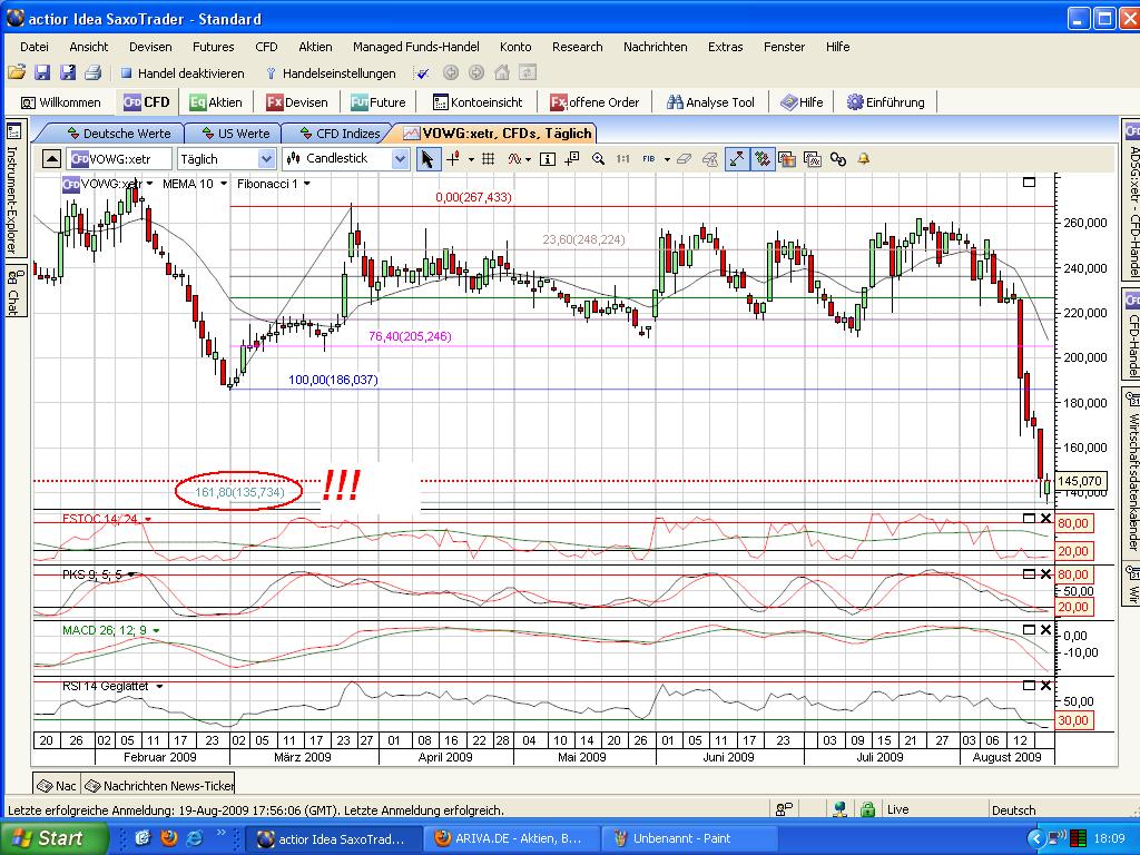 Charttechnik kann sich immer nur auf die Vergangenheit beziehen und kann im besten Falle, wenn sich alles um eine Aktie ohne Wellenbewegung abspielt, einen Trend andeuten, den man als Signal nutzen kann. In speziellen Situationen wie jetzt bei VW ist sie nicht nur irrelevant sondern irreführend.