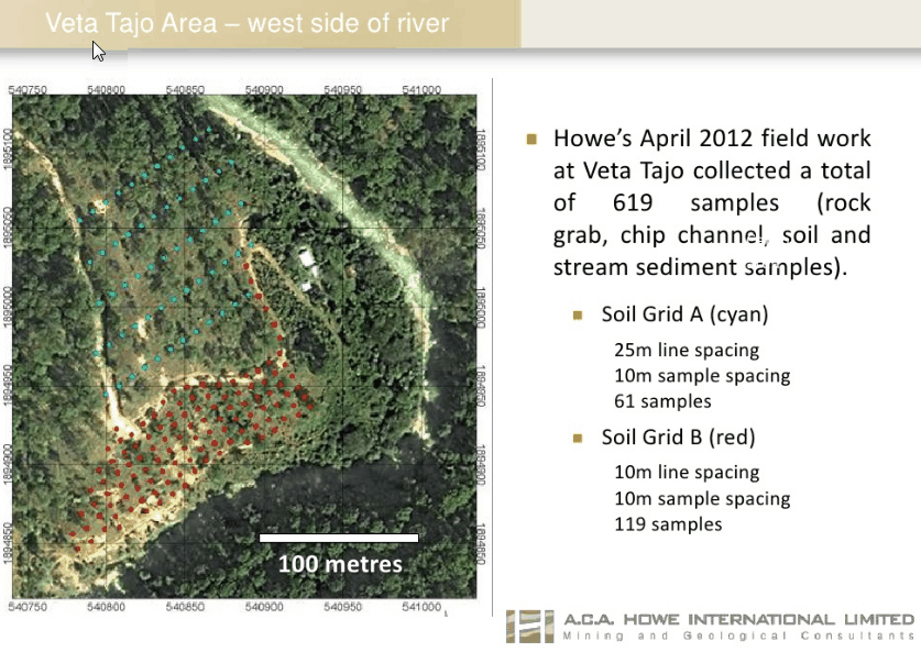 Sampling focussed on the Veta Tajo area located 300 meters southwest of the historical San Javier mine workings. The Company's consultants, A.C.A. Howe International Limited ("Howe") believe the Veta Tajo is a previously unrecognized, unexplored and unexploited area of significant visible stockwork quartz veining that spans an 80 to 100 meter vertical rise in the west bank of the river valley that transects the central property area.