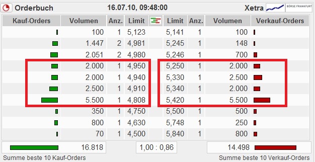 95% des Buches is so deutlich vom Market Maker, das es jeder Angst macht, nicht alleine wegen den extremen Spread von etwa 8% (das ist unfassbar für eine Aktie im Wert von 5€, sowie ein sehr Cashflowstarkes Unternehmen), aber natuerlich auch extrem unverhaeltnissmaessig im Anzahl: 28k wo im Tagessnitt nicht Mal 10k vehandelt werden!