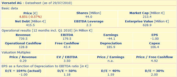 Ohne Abschreibungen hätte Versatel 2009 ein sattes Gewinn je Aktie von 3,38 € vorgelegt. Zudem werden die Zinszahlungen in Zukunft etwa halbieren. Das wird der Gewinn je Aktie nochmal om 0,50 € erhöhen.