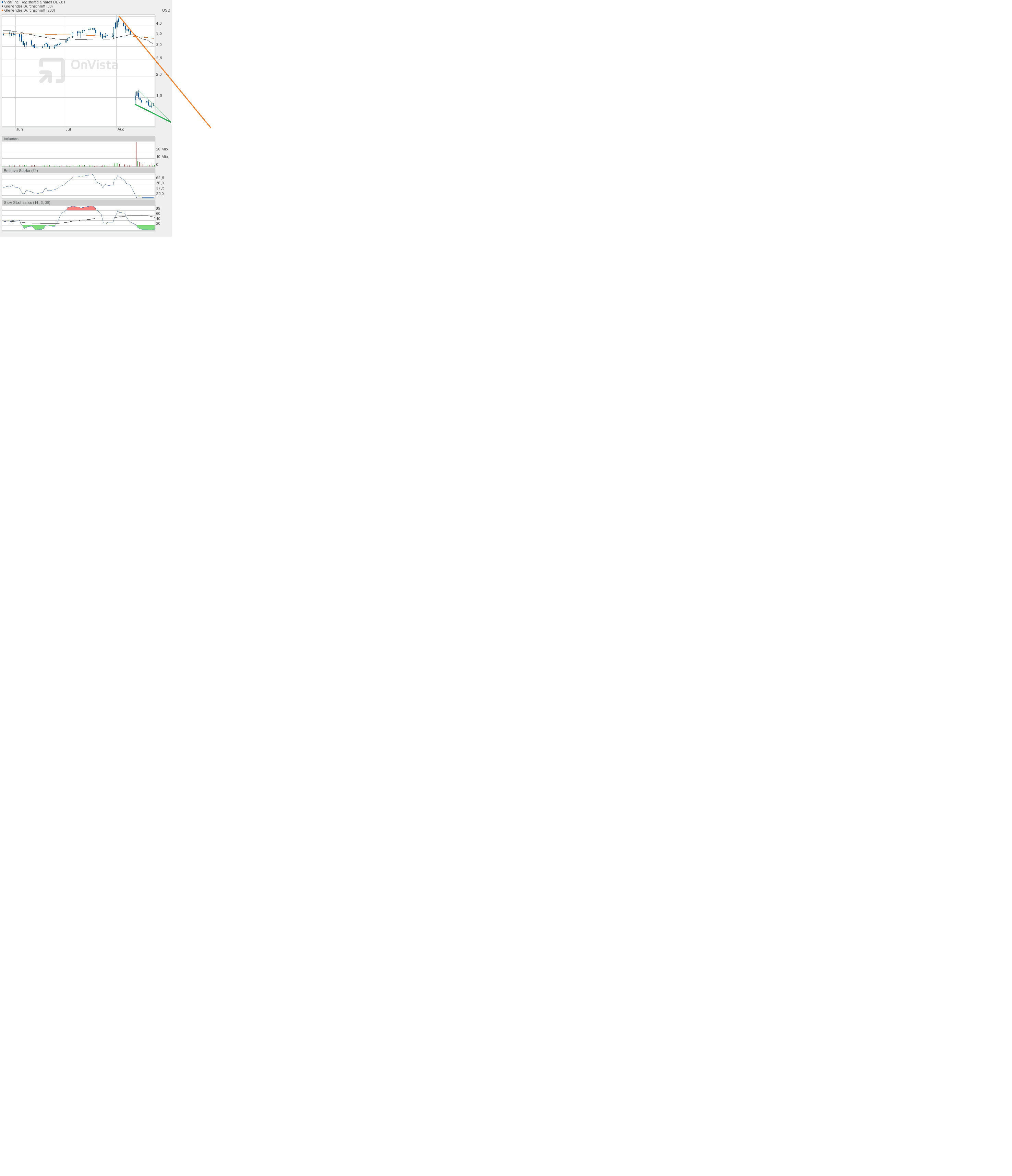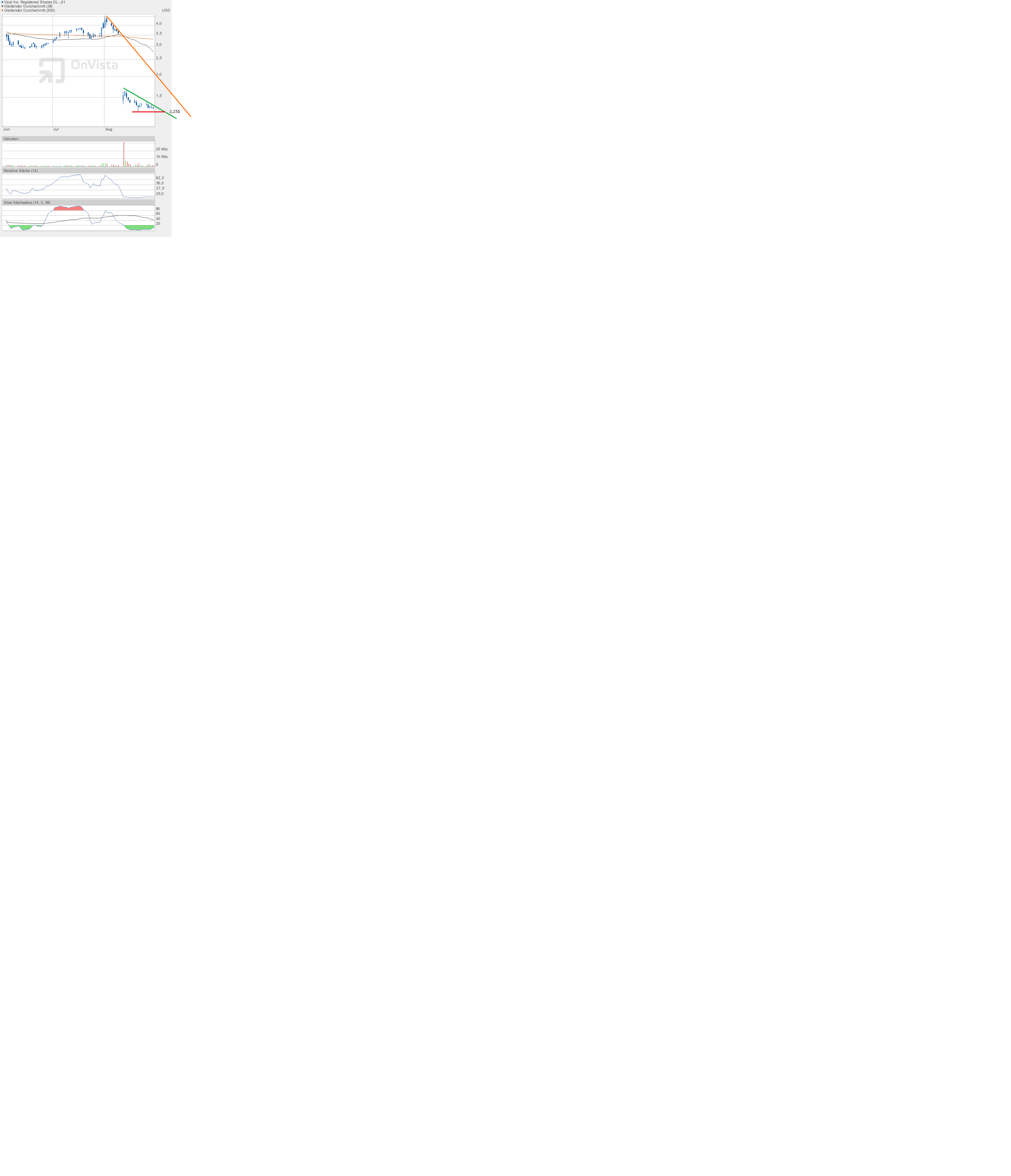 Aber man sieht ja, wann sich beide Linien im Chart erst treffen tun, bei weit unter 1$. Davon gehe ich aber nicht aus, dass es so tief gehen wird. Die Indikatoren lassen das im Moment auch nicht zu. Der Kurs müsste erst wieder steigen, um dann noch tiefer zu fallen. Aber bis dahin ist Vical hoffentlich schon über die orangene Abwärtstrendlinie gesprungen.