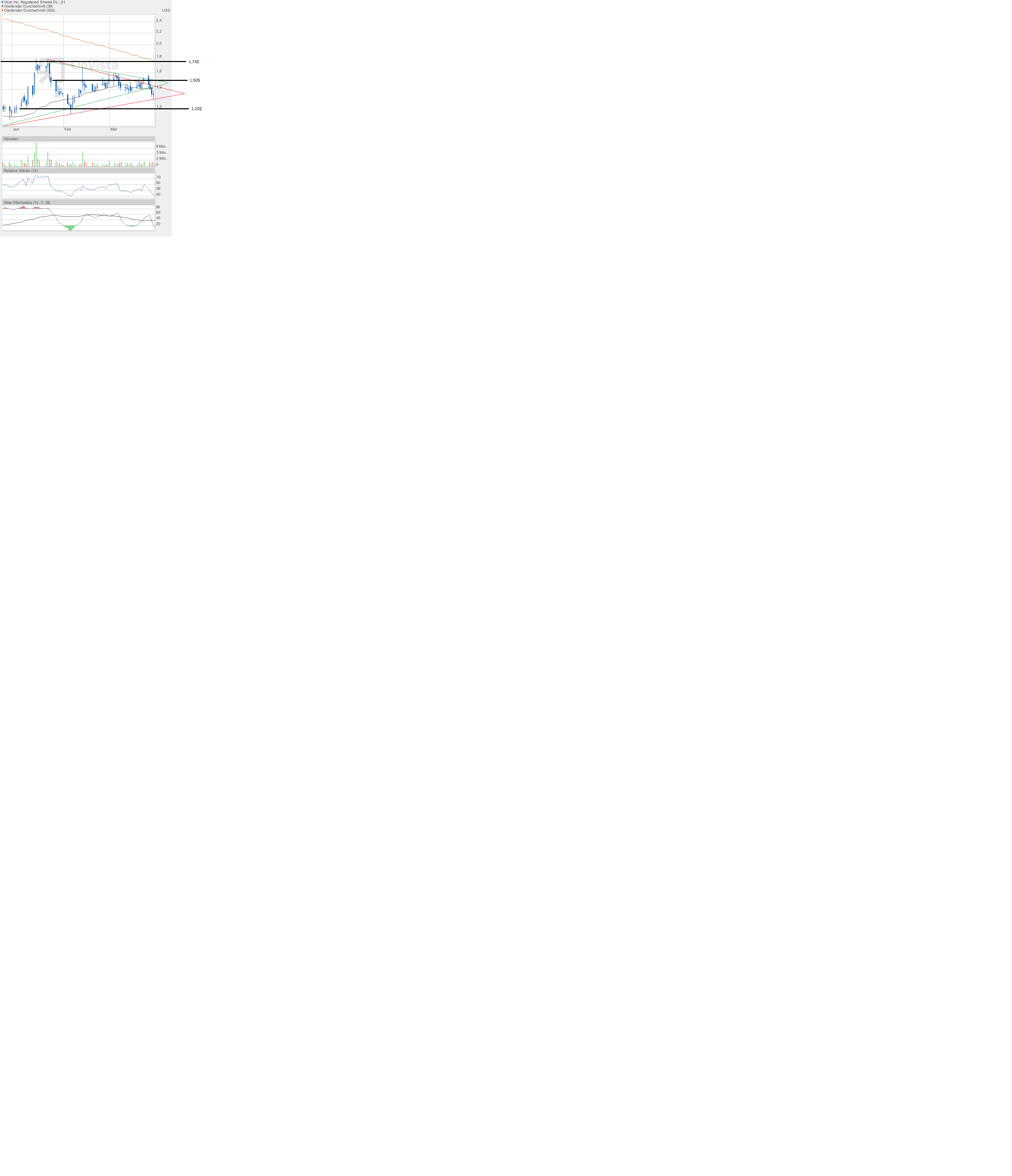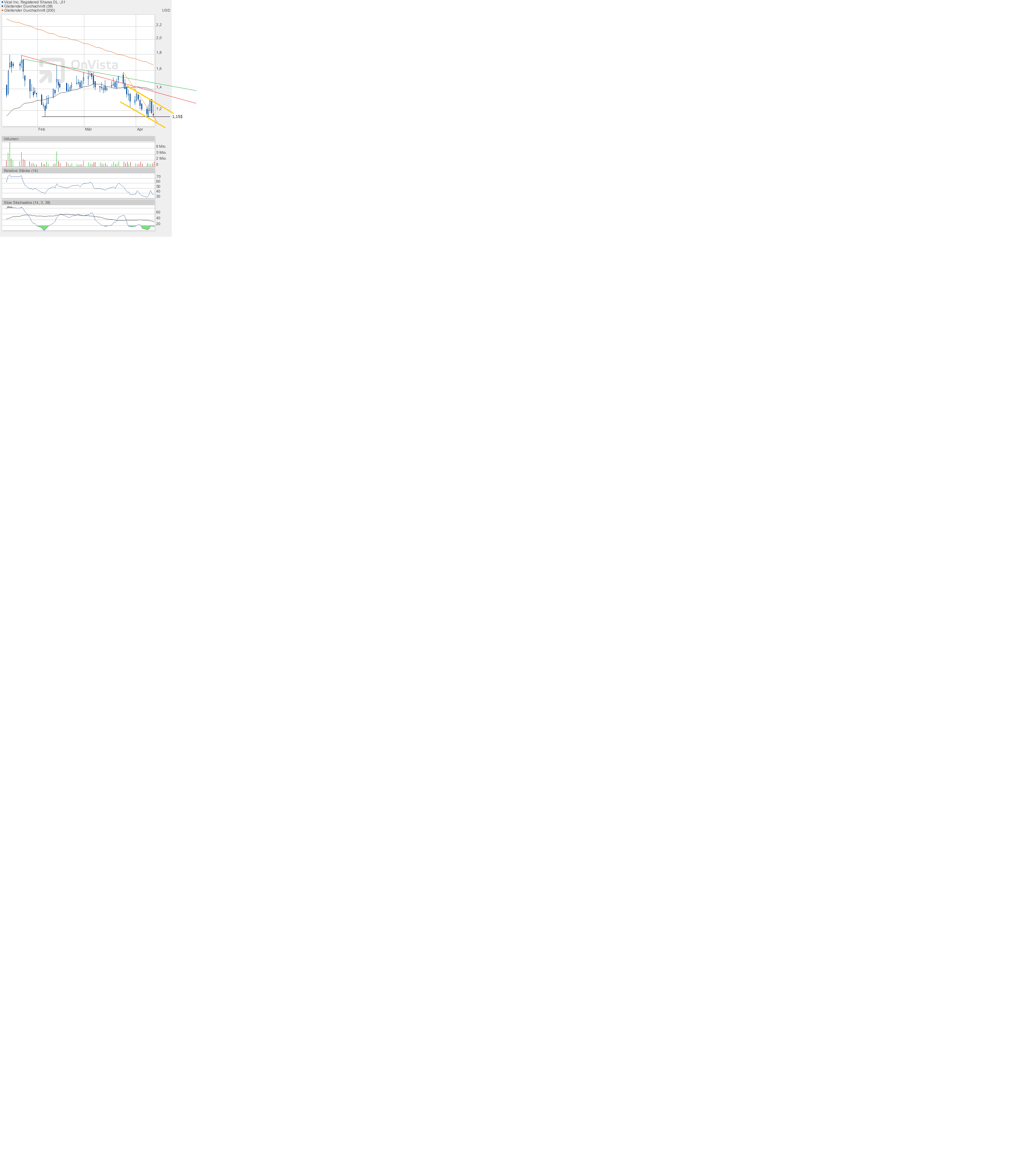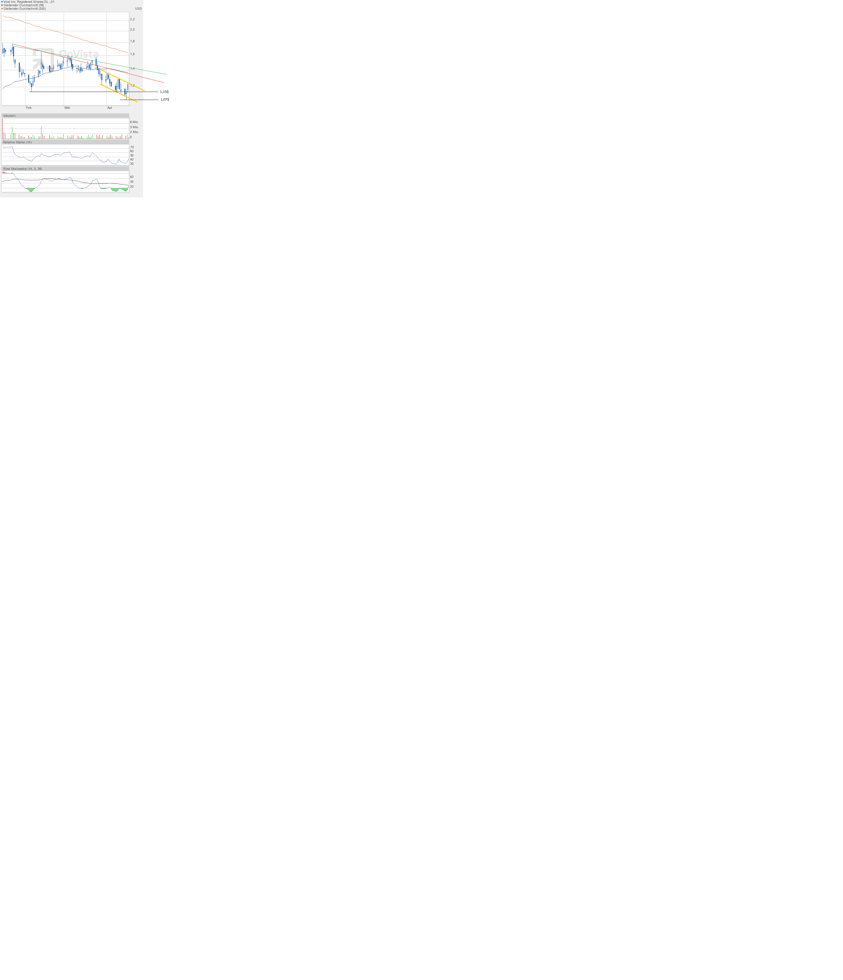 Damit verbleibt Vical klar im gelben Abwärtstrendkanal. Eine Trendwende ist noch nicht zu erkennen. Zum Ende der nächsten Woche reicht schon ein Kurs über 1,20$ aus, um den Ausbruch zu erreichen.