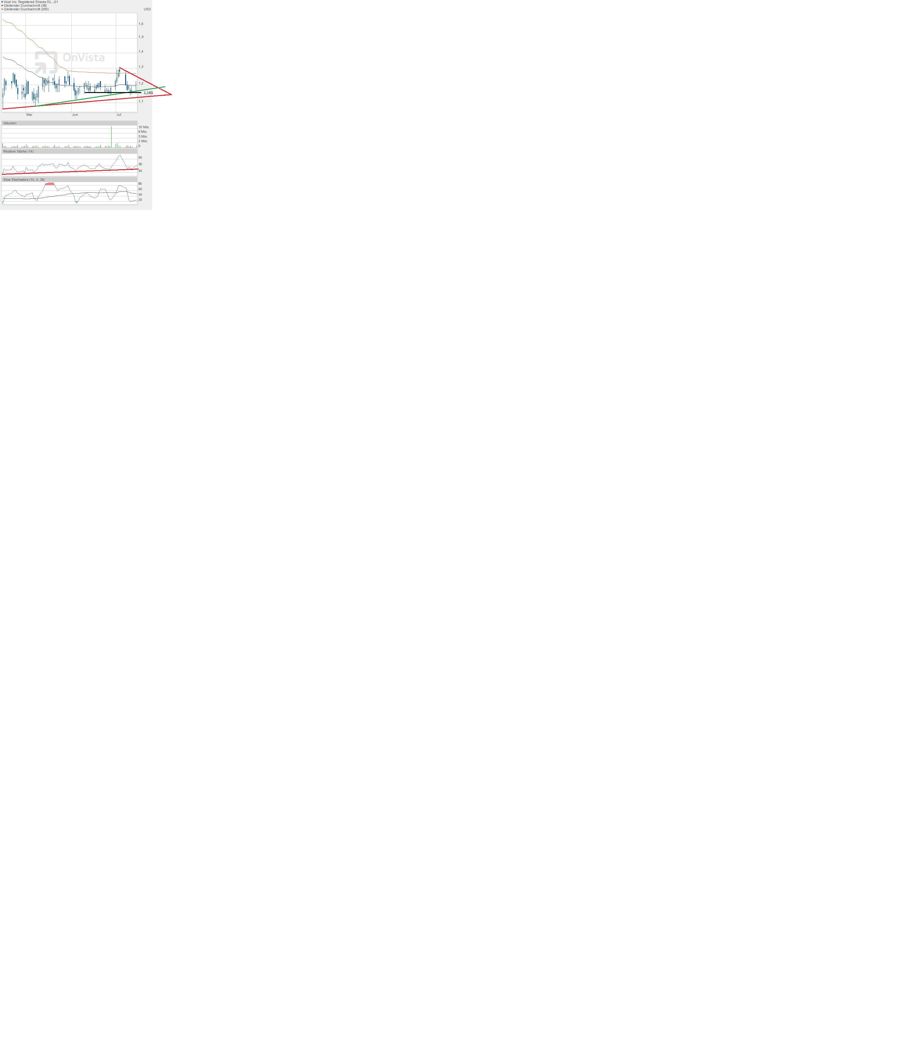 Damit ist zumindest geklärt, warum der Kurs die letzten 3 Handelstage bei 1,29$/1,30$ halt gemacht hat. Hier verläuft die Keil-Oberbegrenzung. Alles über 1,30$ würde den Ausbruch bedeuten.