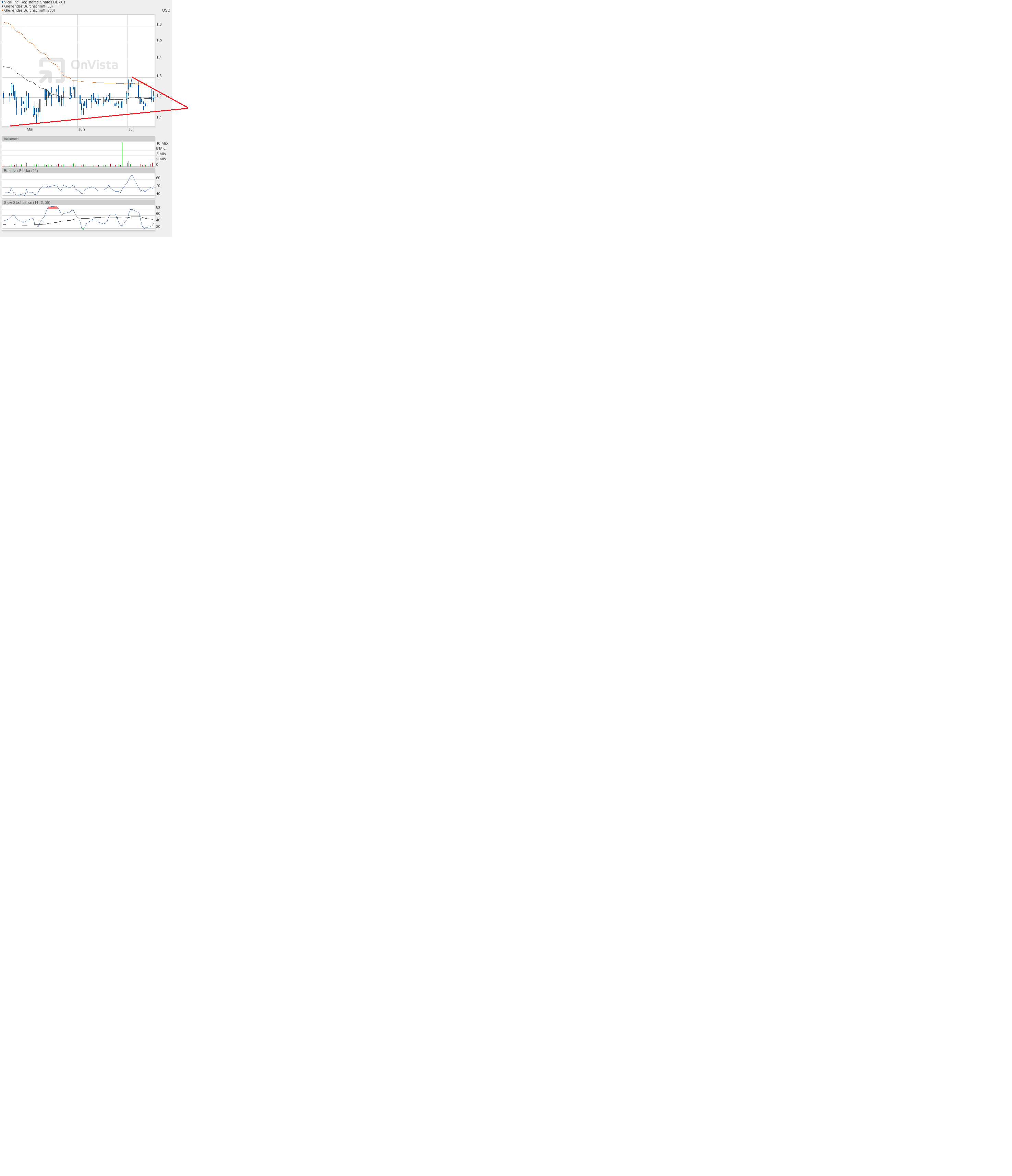 Gestern ging es im Hoch bis auf 1,24$, Schlusskurs 1,19$ bei gutem Volumen von über 1,6Mio Aktien. Dem Chartbild kann man entnehmen, dass es heute bei 1,25$ um den Ausbruch geht, wohlgemerkt im Tageschart. Im Wochenchart müsste es über 1,28$ per Wochenschluss gehen.