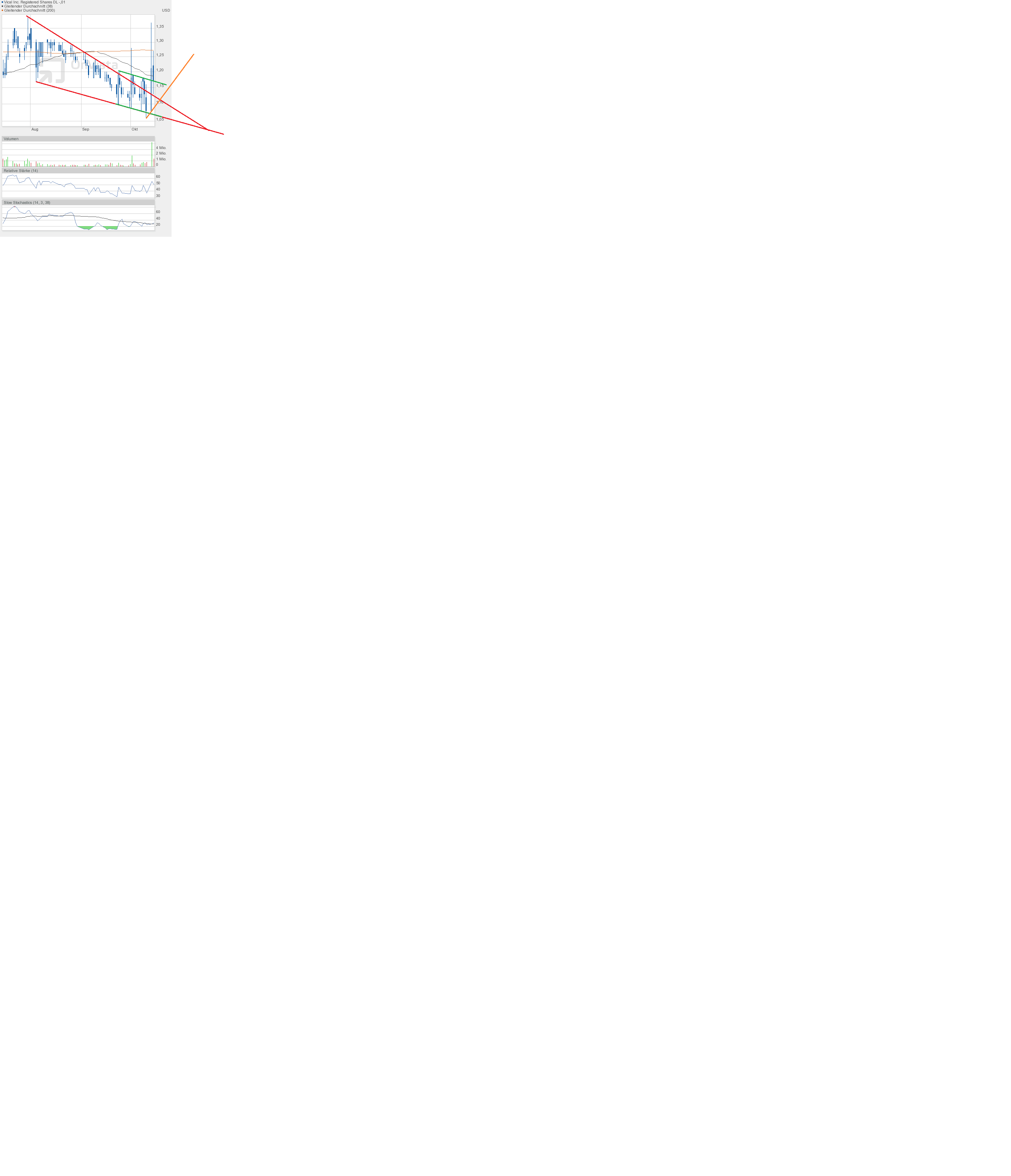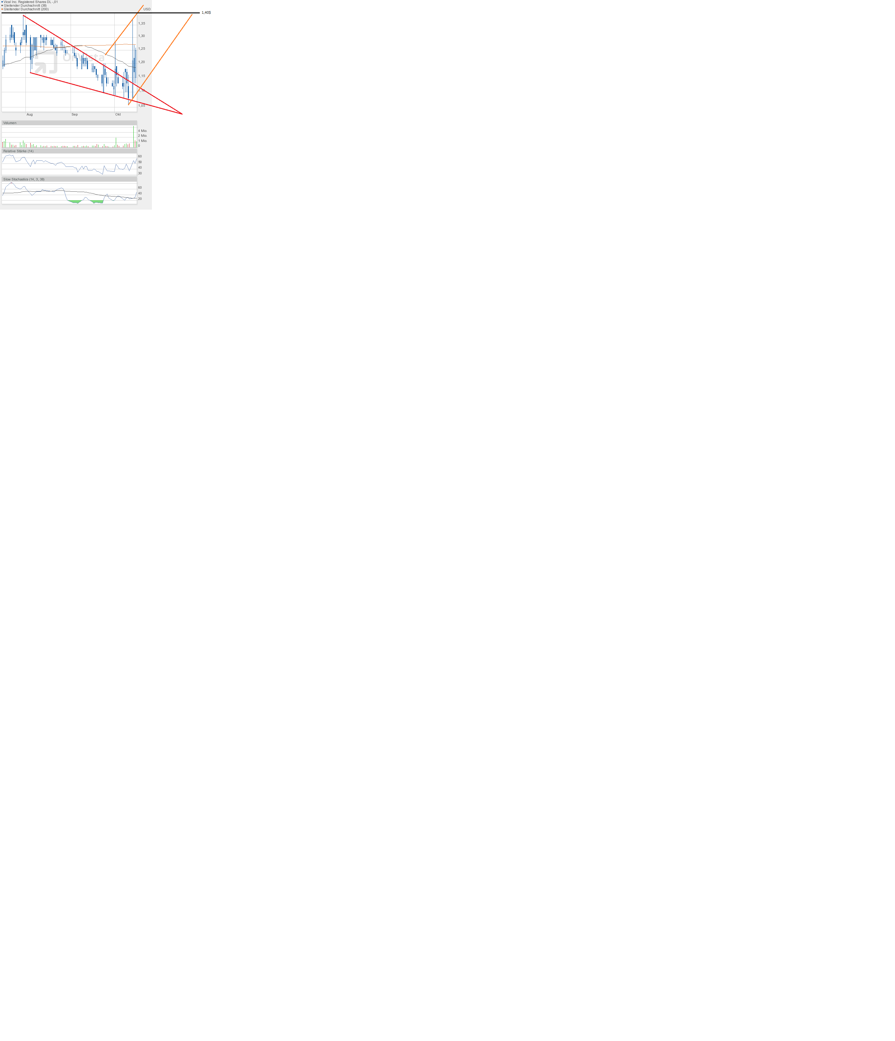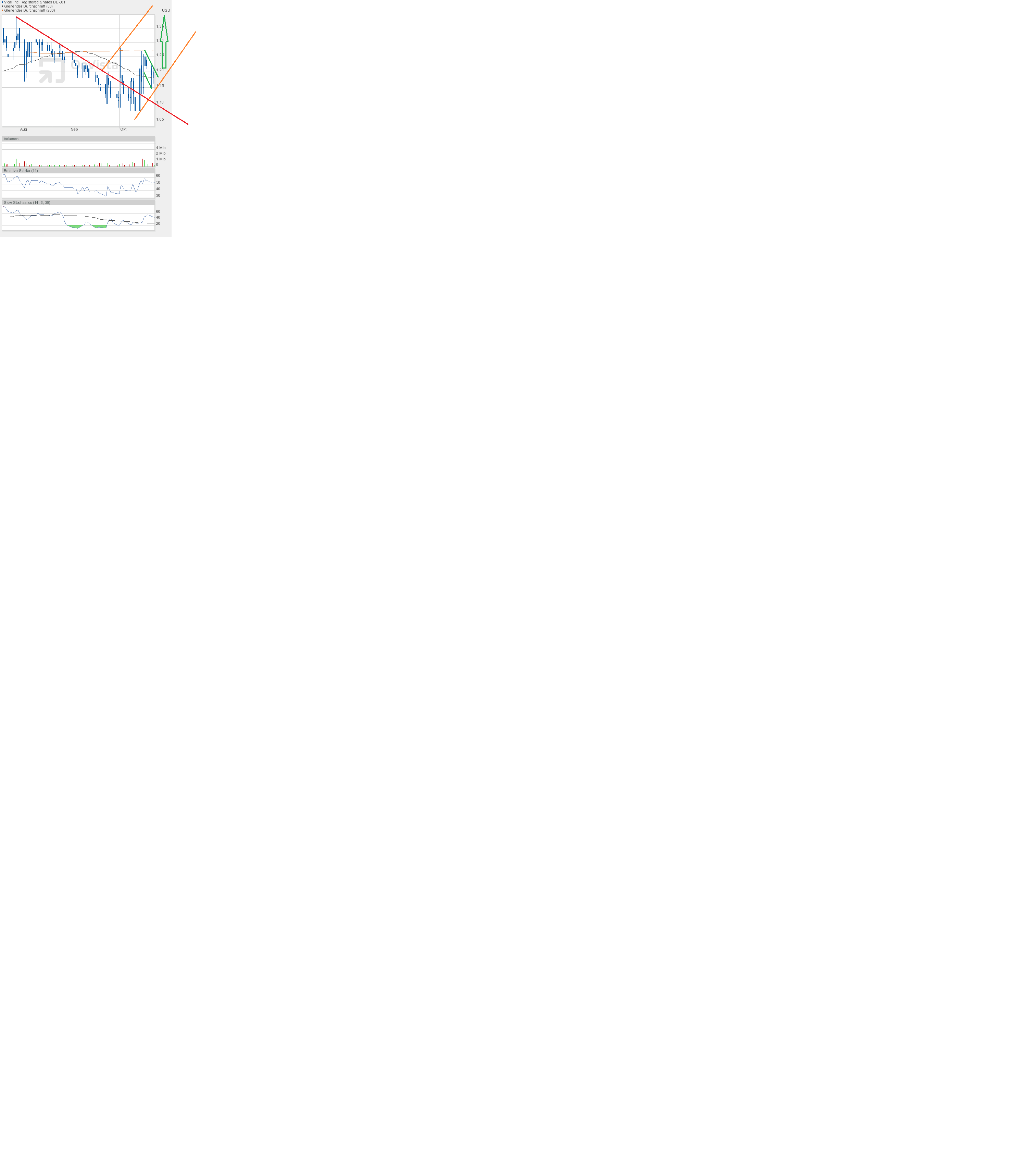 Als ich abends von Arbeit kam, hatte ich schon im Radio von dem sehr schlechten Börsentag gehört. Und da hatte ich mich gefragt, wie weit wohl Vical gefallen sein muss. Das Allzeittief könnte erreicht worden sein. Ich war fast ein wenig erschrocken, was ich zu sehen bekam. Vical drehte nach oben weg und konnte mit 1,25$ per Schlusskurs einen Tagesgewinn von fast 7% ergattern. Da tut sich viel Schadenfreude breit, wenn man sich die vielen gebeutelten Werte des Tages anschauen muss. Und so scheint der gestrige Tag wohl tatsächlich ein Weg weisender Tag gewesen zu sein. Der rote Keil ist endgültig verlassen, der bekannte grüne Abwärtstrendkanal hat keine Bedeutung mehr und spielt ab sofort keine Rolle mehr. Ganz im Gegenteil, nun liegt ein sehr breiter orangefarbend dargestellter Aufwärtstrend vor. Ziel 1,40$.