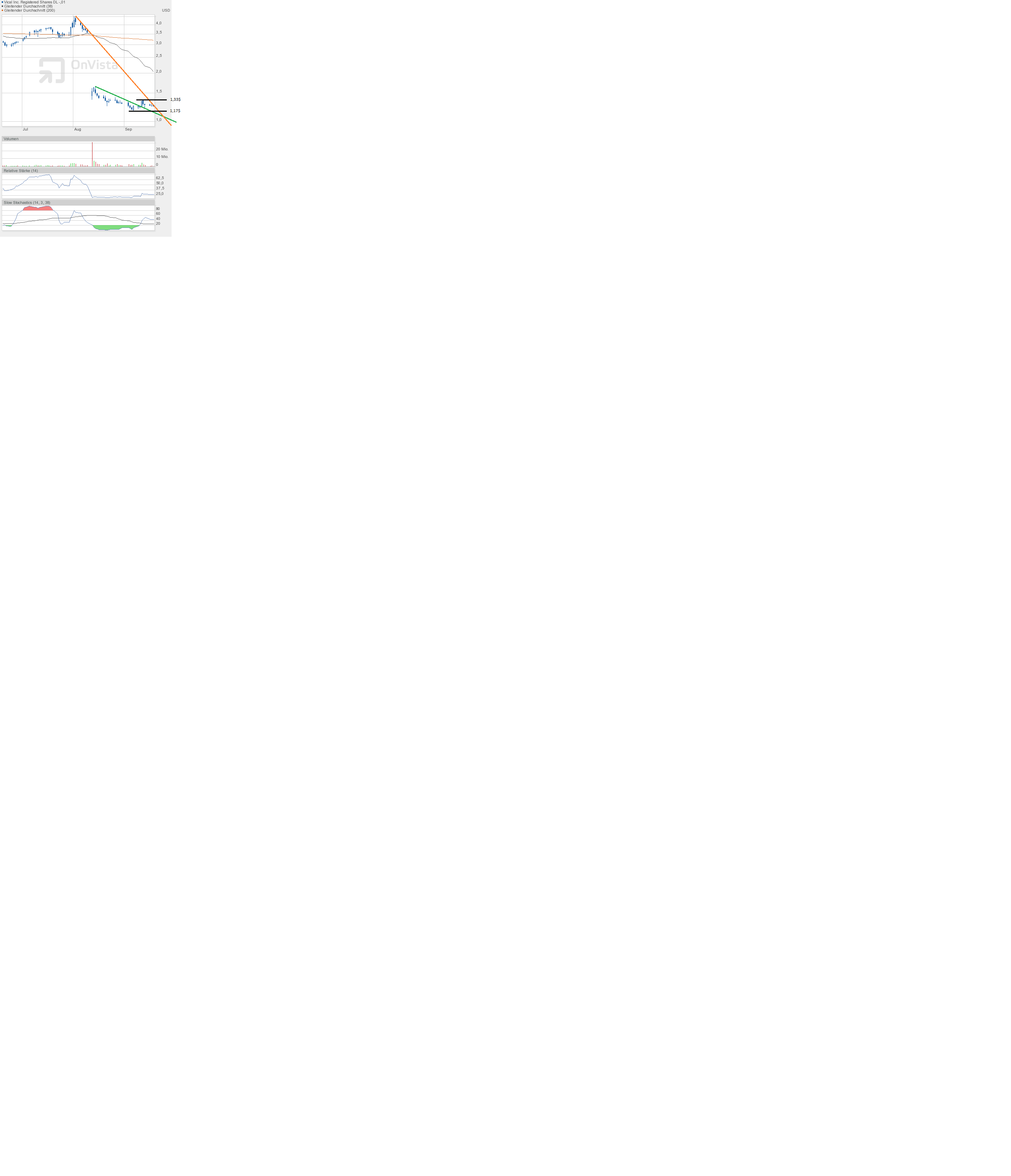 Und man hat wieder gesehen, dass Charttechnik funktioniert. Auch wenn Vical die jüngste Aufwärtsbewegung der Gesamtmärkte nicht mitgemacht hat, was den heutigen Tag angeht, konnte sich die Aktie den Tagesverlusten der US-Börsen durch den Ausbruch entziehen und im Plus schließen. Schlusskurs 1,25$ bei relativ ordentlichem Volumen von über 1,5 Mio Aktien.