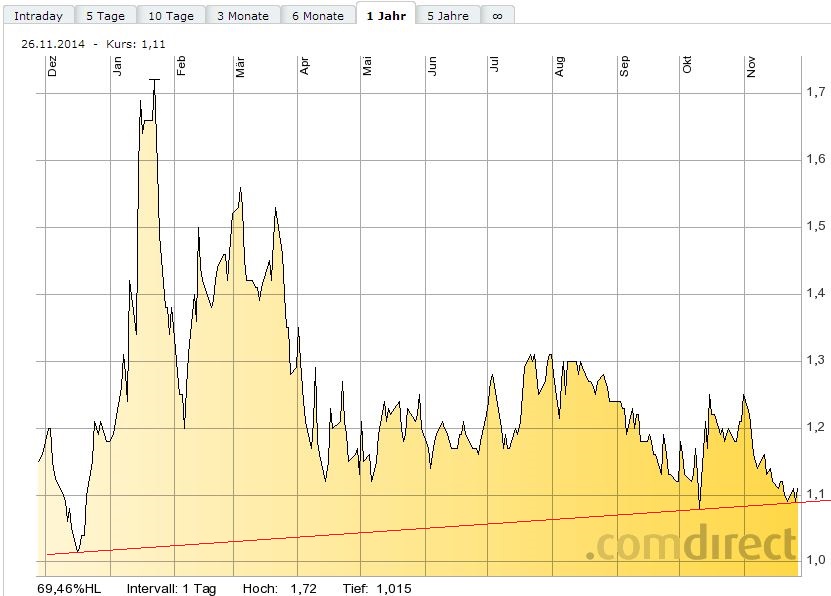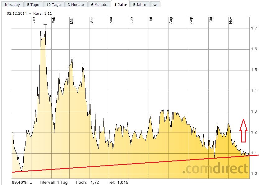 Die Einschätzung vom Vortag war ganz treffend gewesen. Gestern war das Allzeittief bei 1,01$ zum Ziel ausgegeben worden. Gut, das Tagestief lag bei 1,02$, aber da sollte man nicht so kleinlich sein.