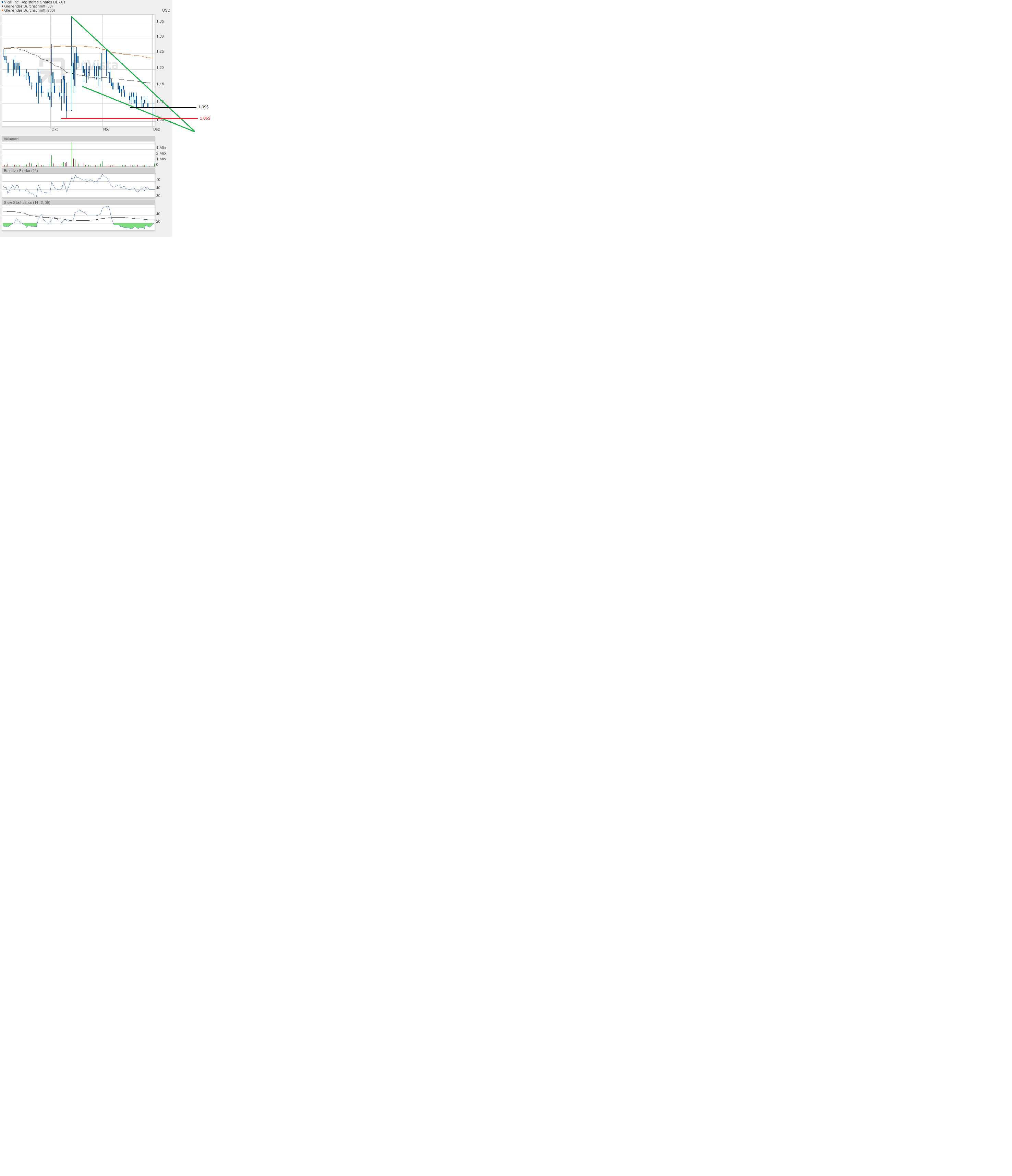 Aber was ist gestern eigentlich passiert? Eigentlich nichts. Kein Kurs unter 1,06$. Damit bleibt die Welt in Ordnung. Schlusskurs 1,08$ im Keil. Aber das kennen wir ja schon.