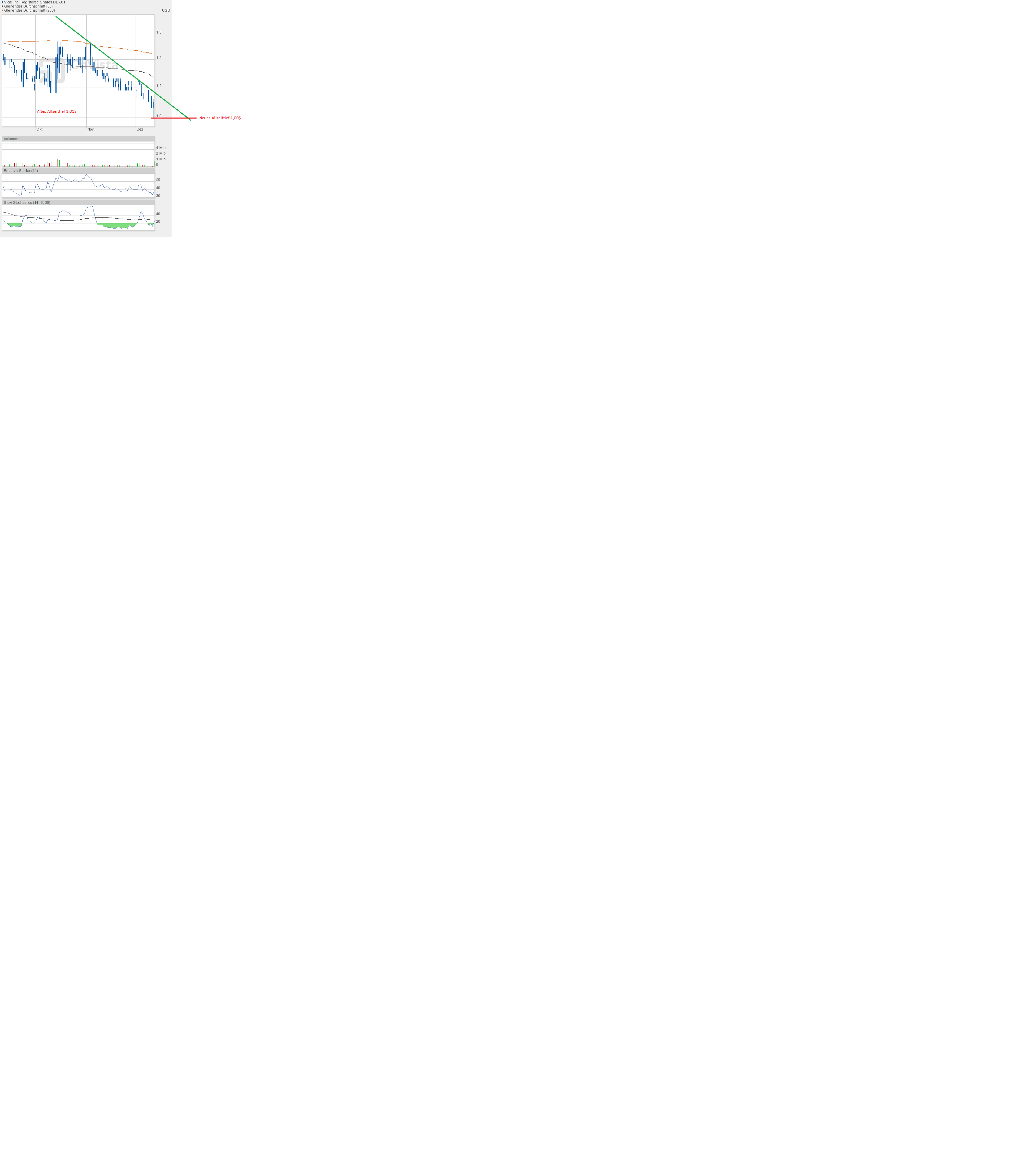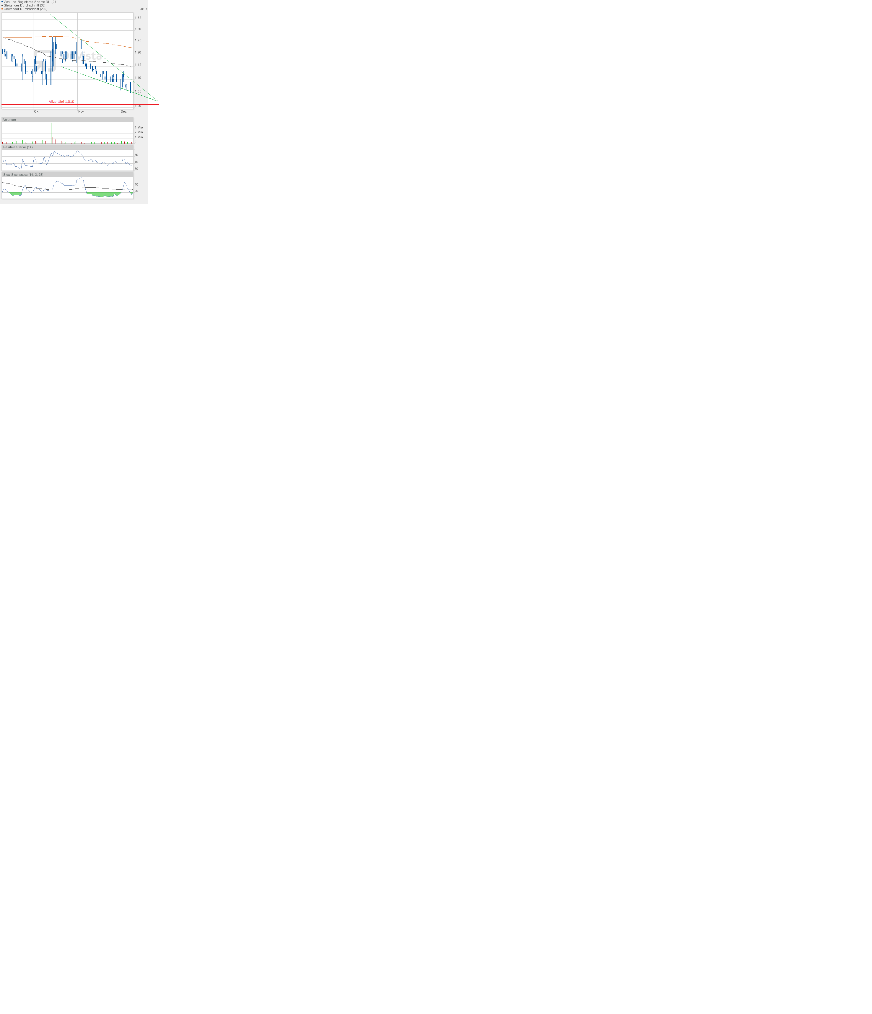 Die Indizes eilen von Rekord zu Rekord, und Vical wird immer wieder vom Allzeittief bei 1,01$ wie magisch angezogen. Dennoch bleibt es fundamental unwichtig. Denn Vical ist bestens aufgestellt. Die Finanzlage ist sehr beruhigend. Deshalb gehe ich nicht davon aus, dass die 1$-Marke jemals unterschritten wird. Wir hatten die Situation schon mehrfach. Und auch diesmal scheint der Kurs mehr als ausgebombt. So richtig nach unten will er irgendwie nicht mehr. Und auch die Indikatoren lauern eher auf die Chance nach oben auszubrechen, denn weiter nach unten können sie fast nicht mehr.