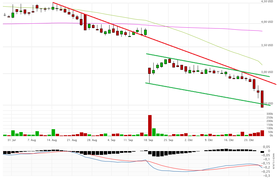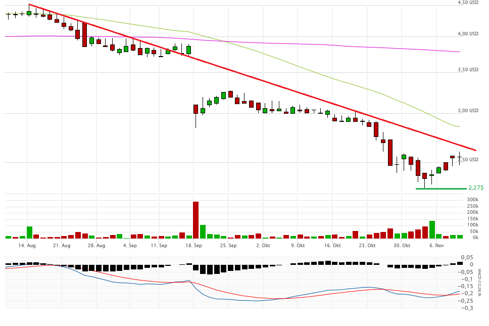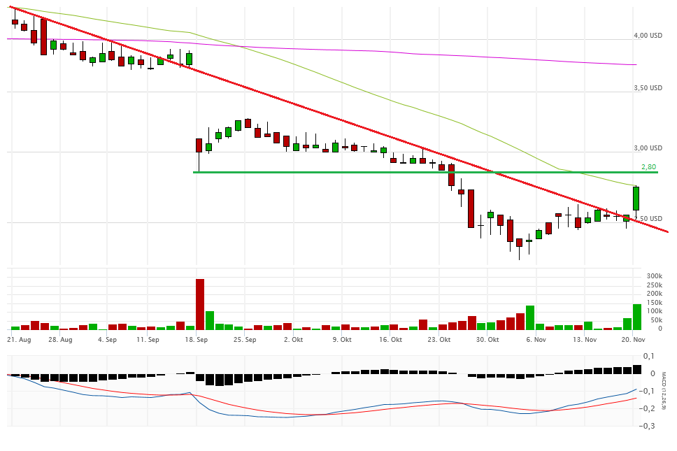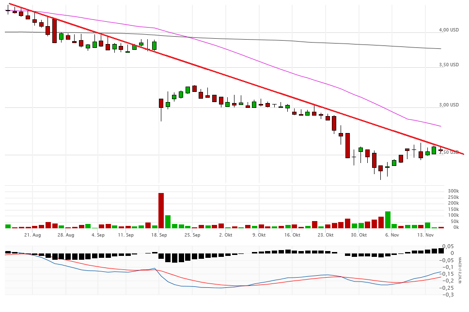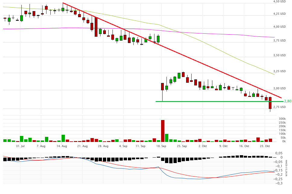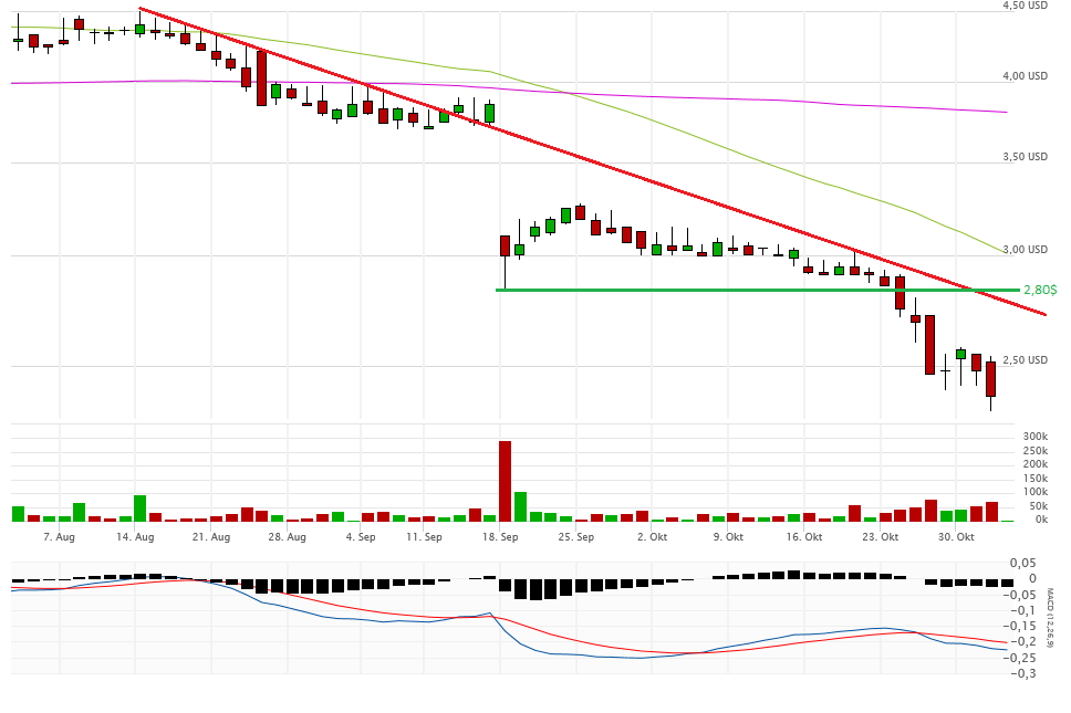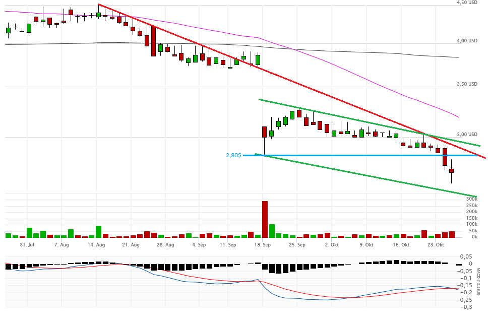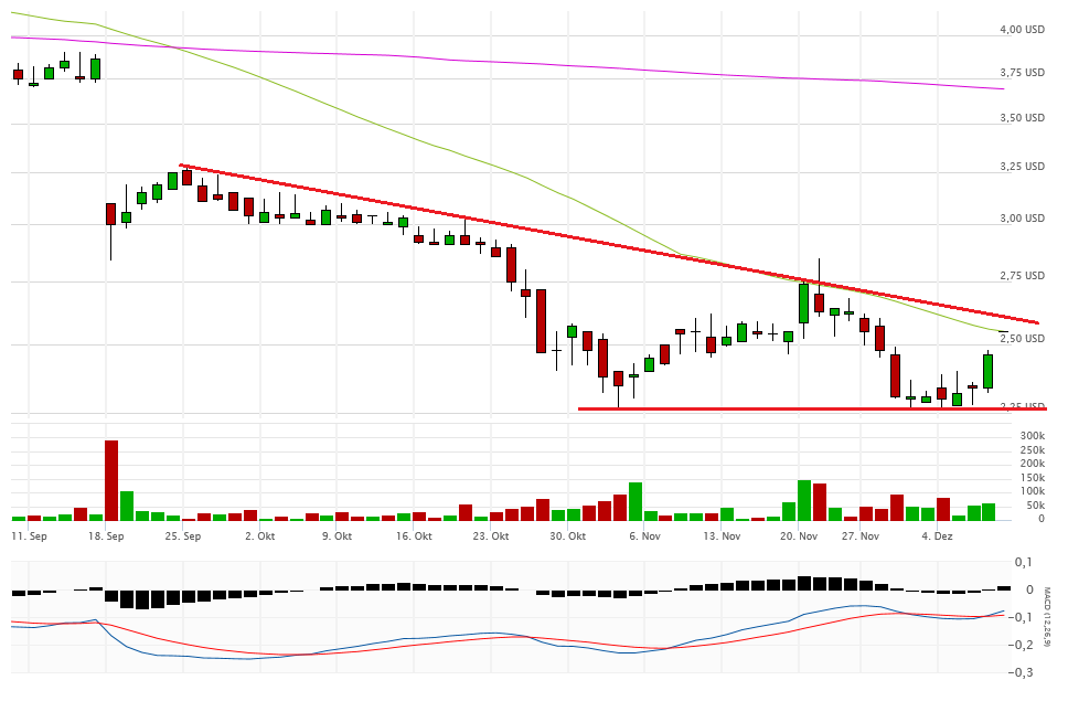 Fakt ist, alles unter 2,80$ ist very bad. Gestern schloss die Aktie aber auch noch mit 2,47$ auf Tagestief sogar noch unterhalb eines möglichen Abwärtstrendkanals. Eine Erholung bis 2,80$ ist jederzeit denkbar, aber im Moment sieht es nicht gut aus. Die 2-Dollar-Marke könnte demnächst angesteuert werden.