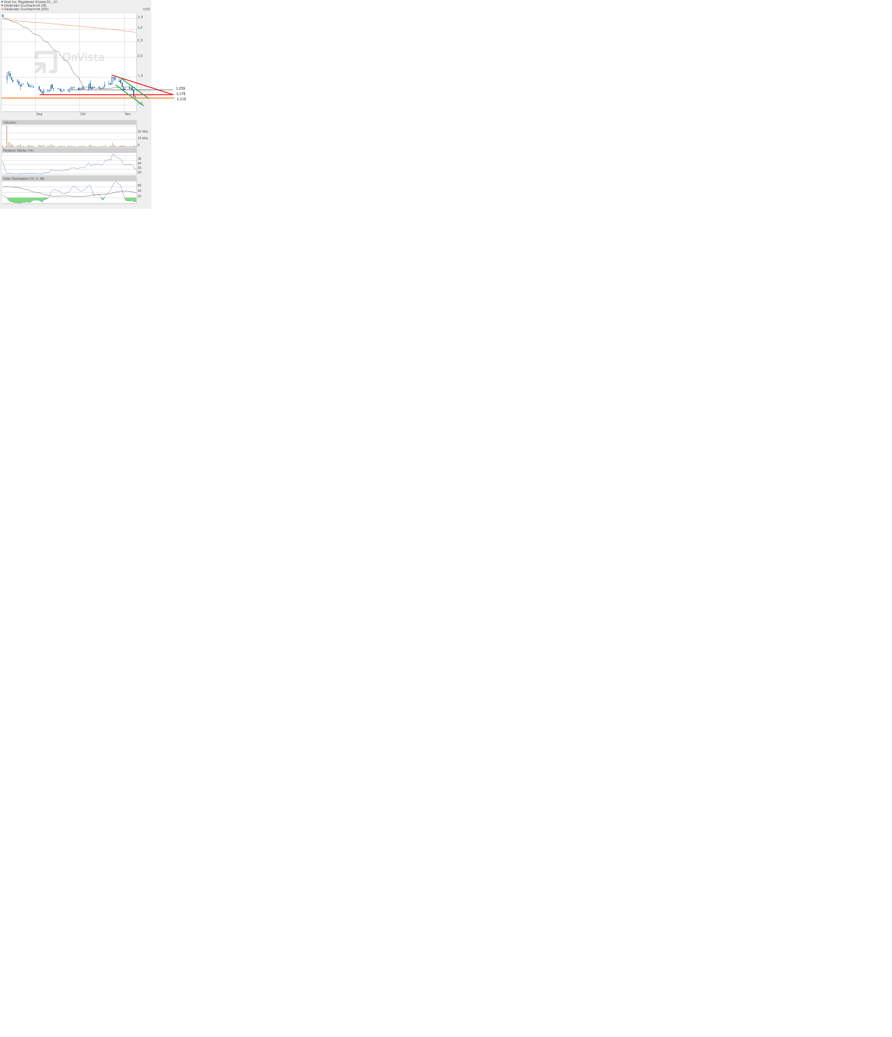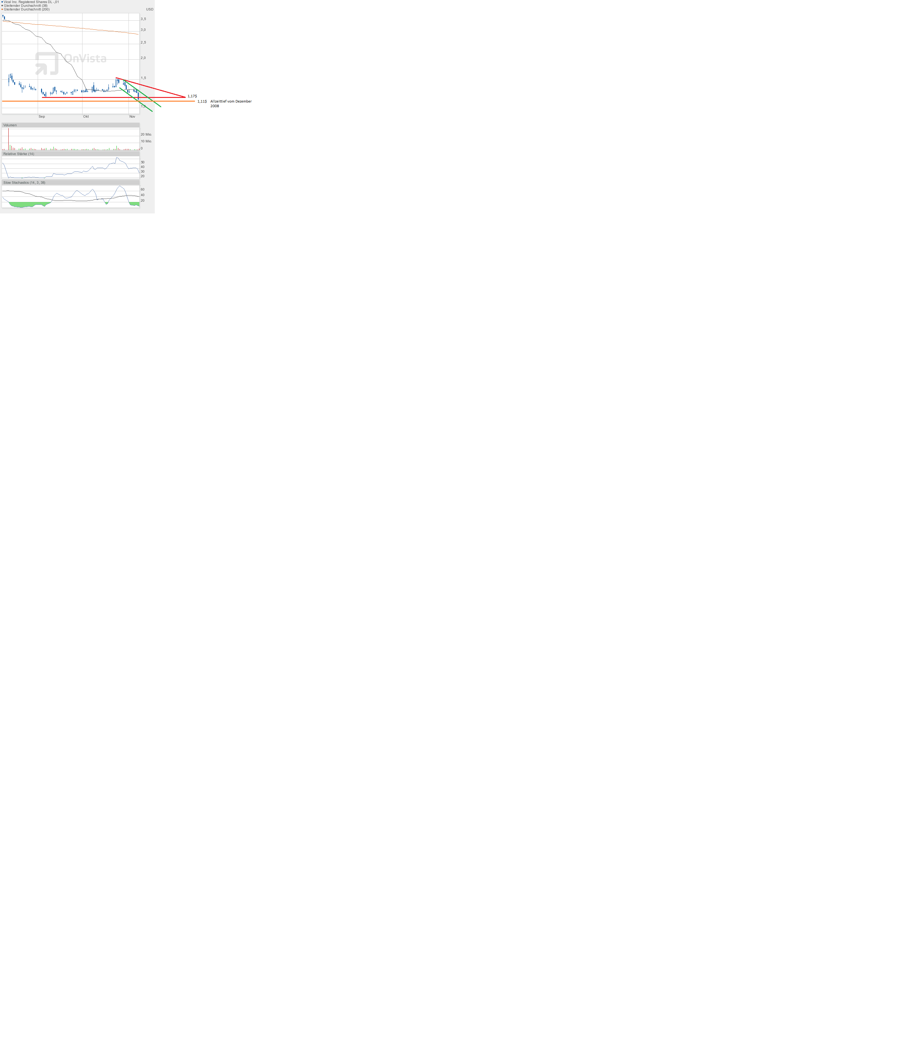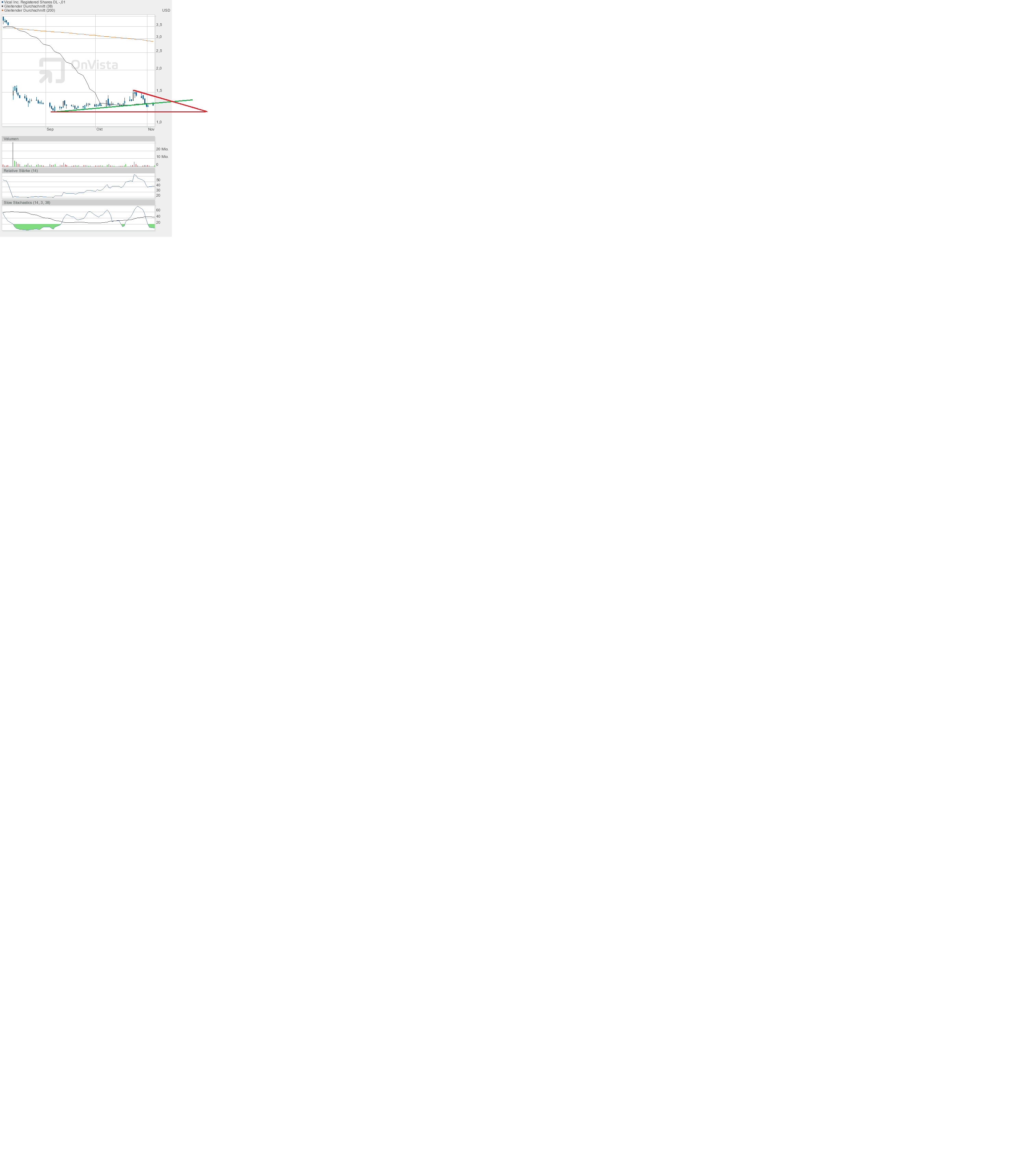 Fakt ist aber: Die Aktie ist deutlich überverkauft, das zeigt der Slow Stochastic. Die Aktie hat deutlich Nachholbedarf gegenüber den Gesamtmärkten, die in den letzten Tagen nach oben laufen, wobei Vical fallen tut.