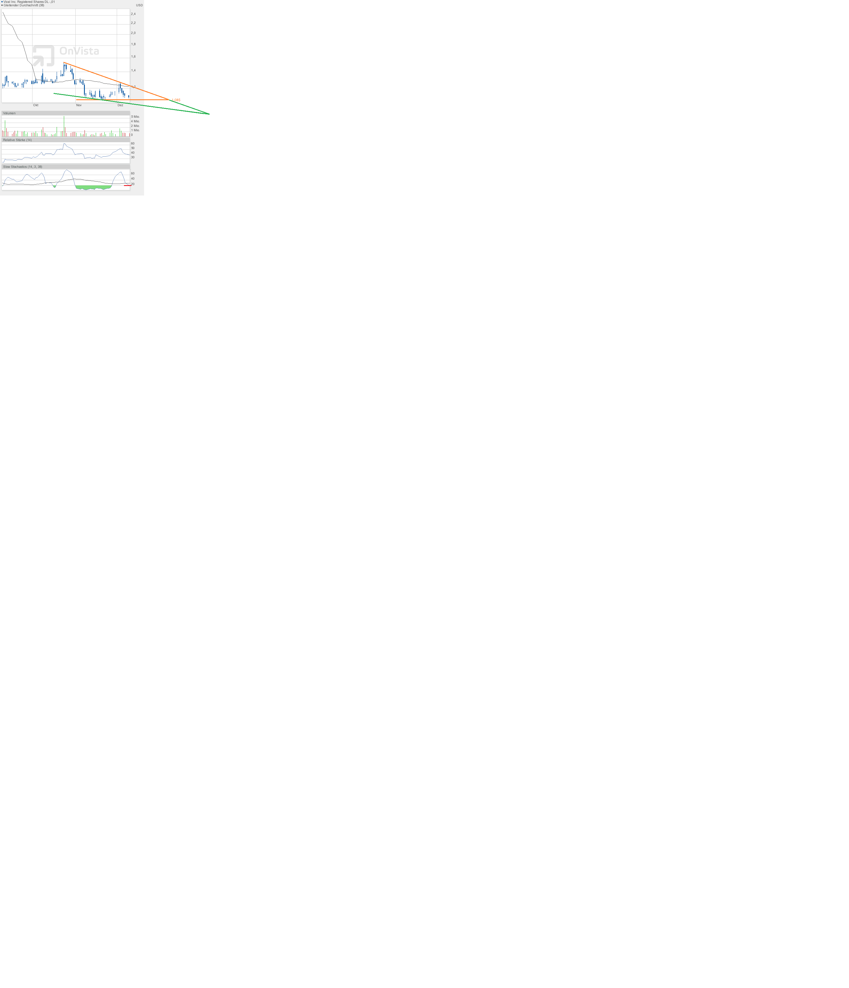 Es gelingt aktuell nicht einmal der Sprung über 1,17$. Der abfallenden roten Linie kommt man auch nicht näher. Der Sprung darüber ließe einen ordentlichen Kursanstieg erwarten. Der Ausbruch sollte doch im Dezember irgendwie gelingen.