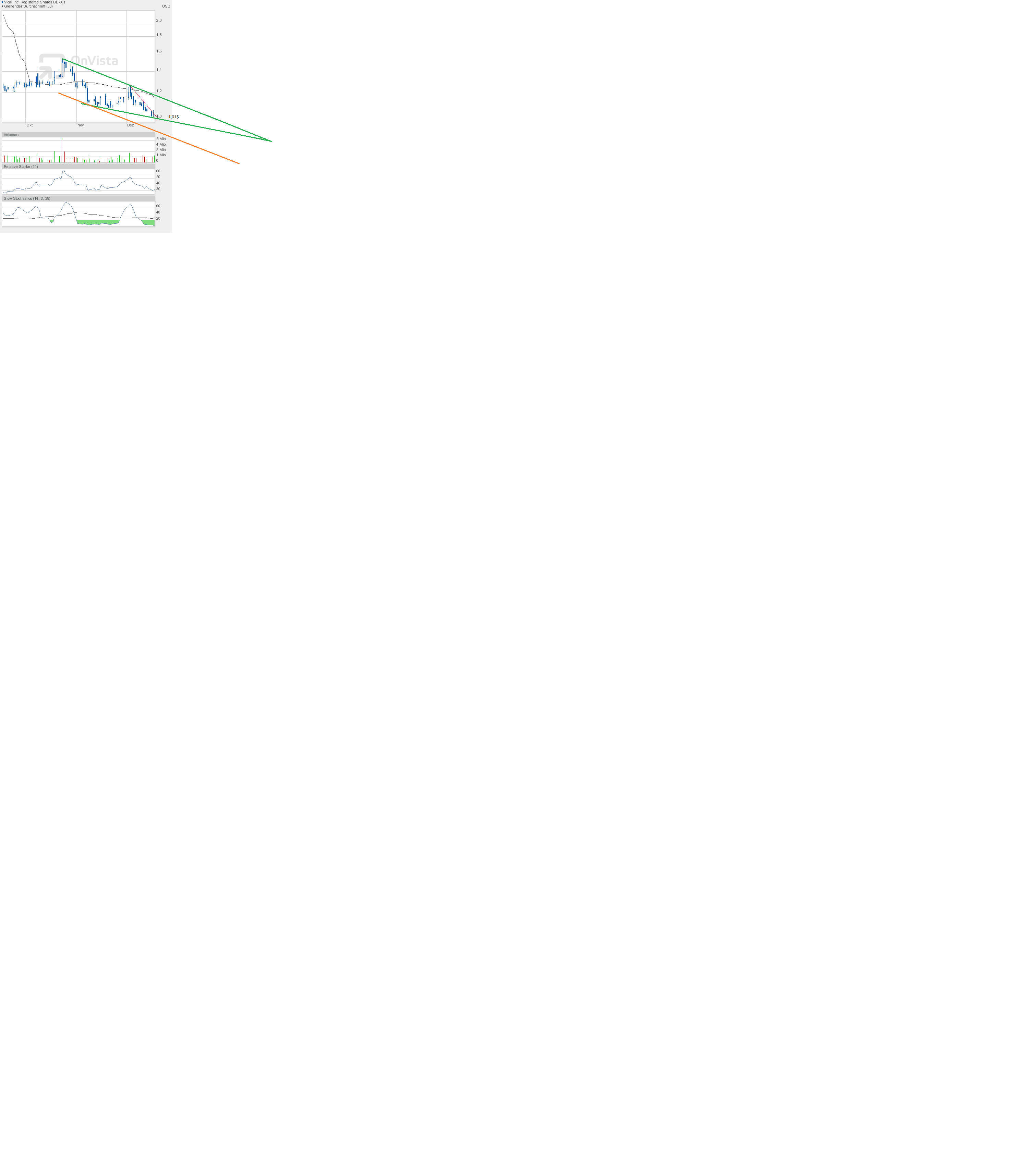 Sollte der grüne Keil nicht halten, dann dürfte wohl ein breiter Abwärtstrendkanal die Folge sein, dessen Unterbegrenzung die orangene Linie darstellen würde. Dann wäre ein Abrutschen bis 0,90$ denkbar.