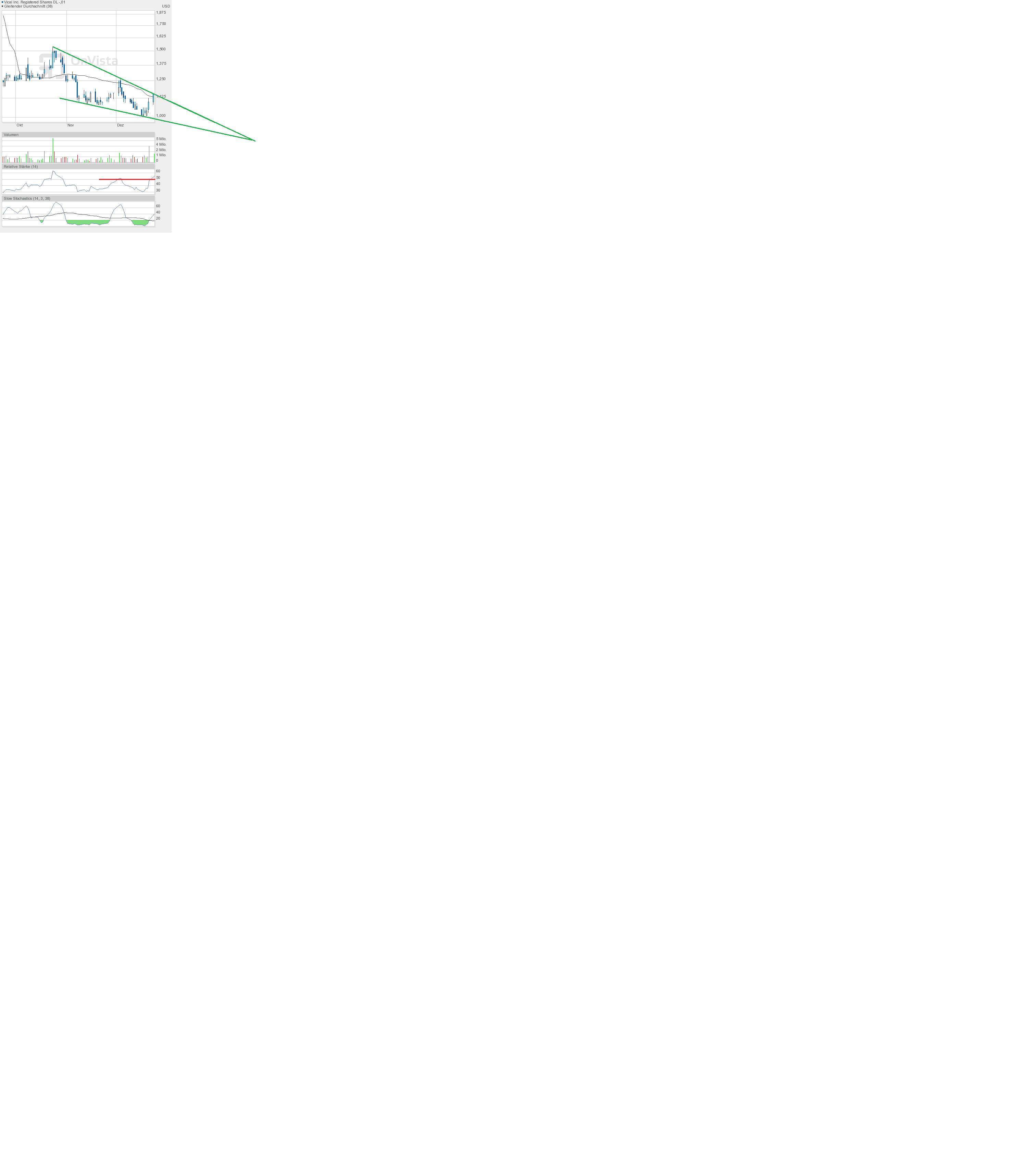 Charttechnisch ist damit ein weiteres Verkaufsignal gegeben. Wer das Chartbild genau ansieht, dem fällt auf, dass die untere Begrenzung des grünen Keils leicht angepasst wurde. Das ist dann aber auch die letzte Haltestelle.