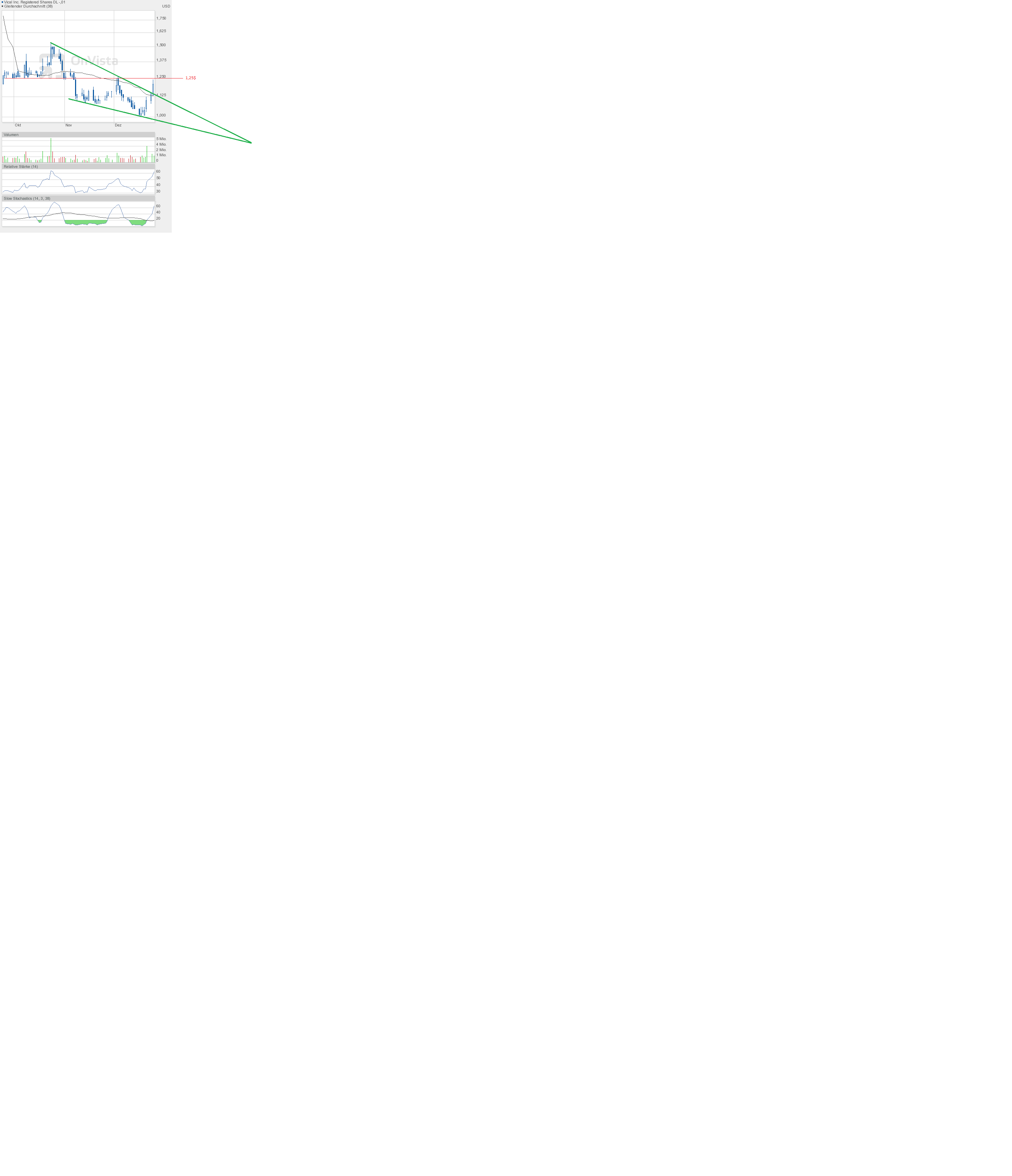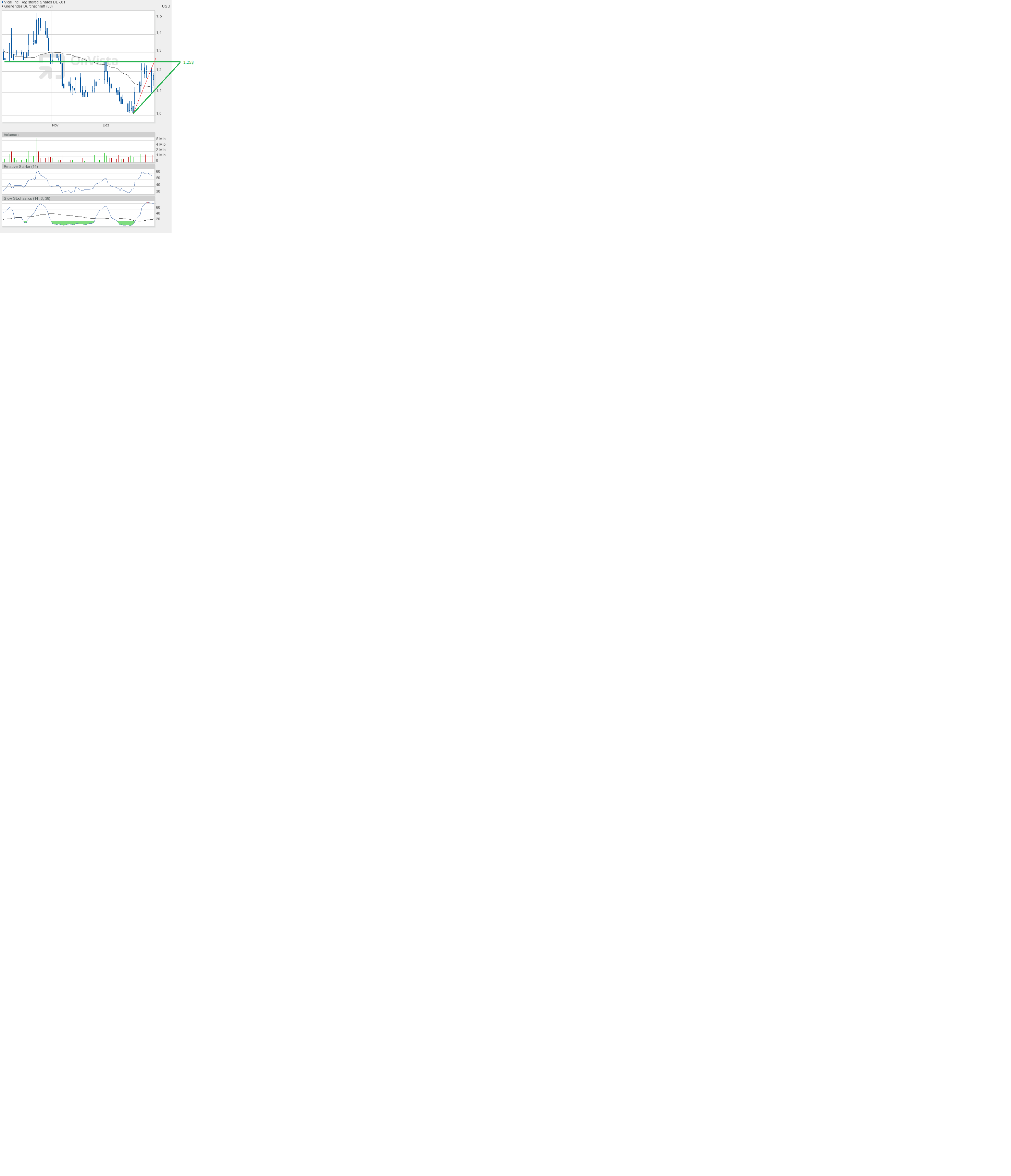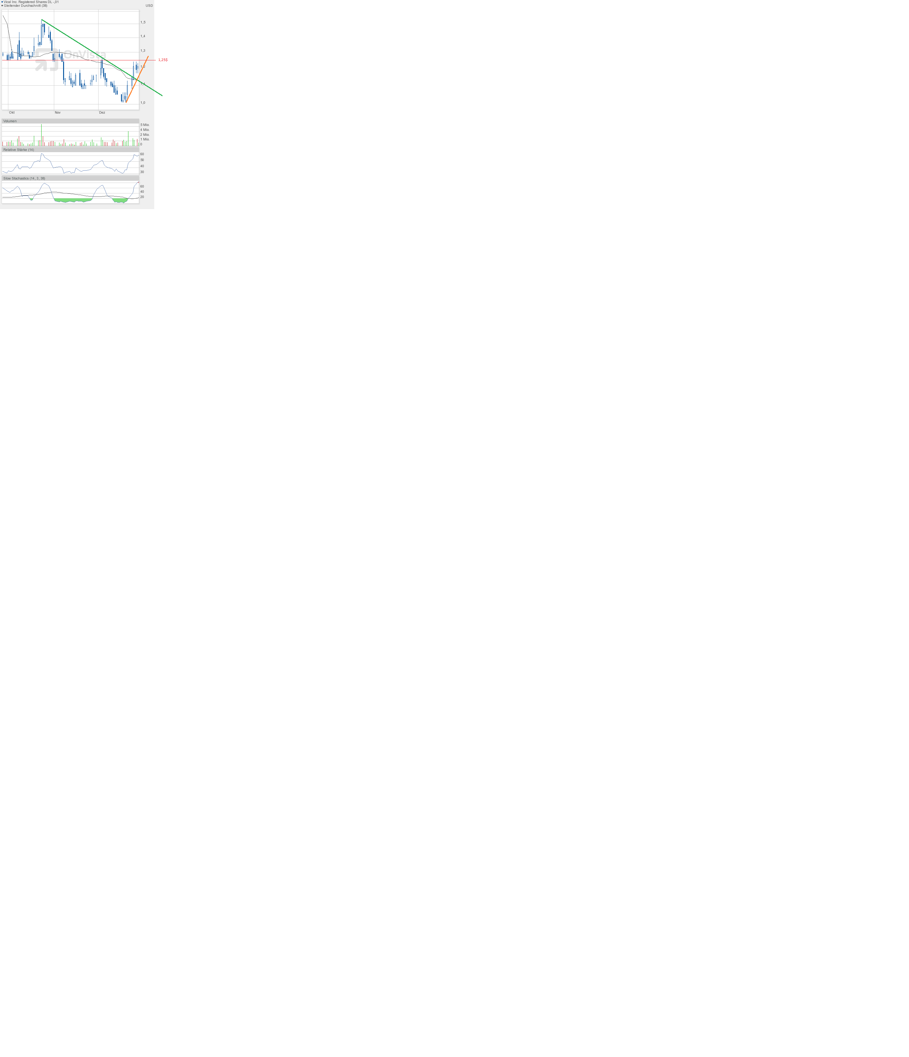 Vical hat sich vorerst bei knapp unter 1,25$ eingenistet. Einen Versuch, den Widerstand zu überwinden, gab es heute nicht wirklich. Tageshoch 1,23$, Schlusskurs 1,21$.