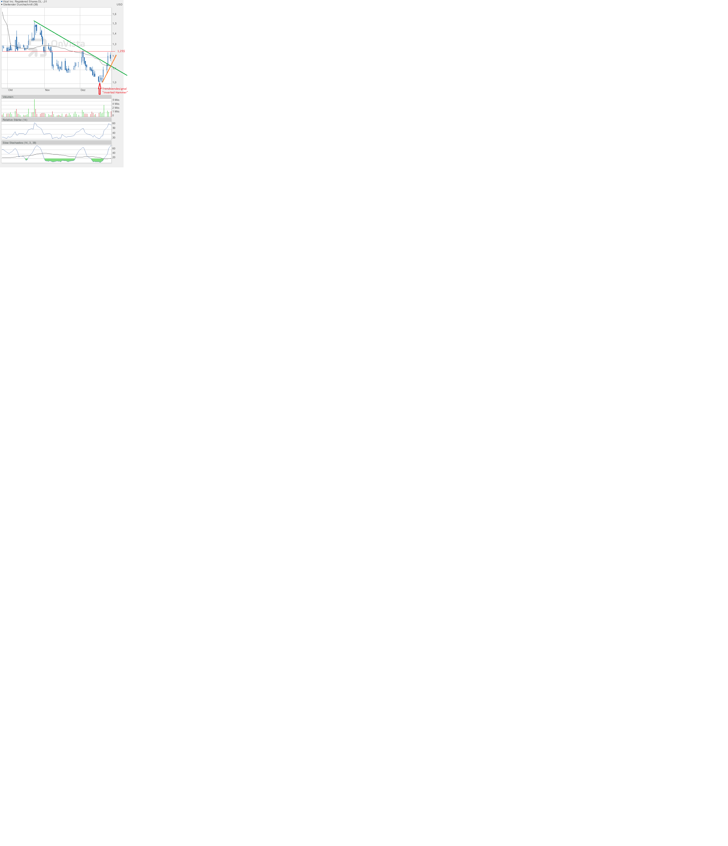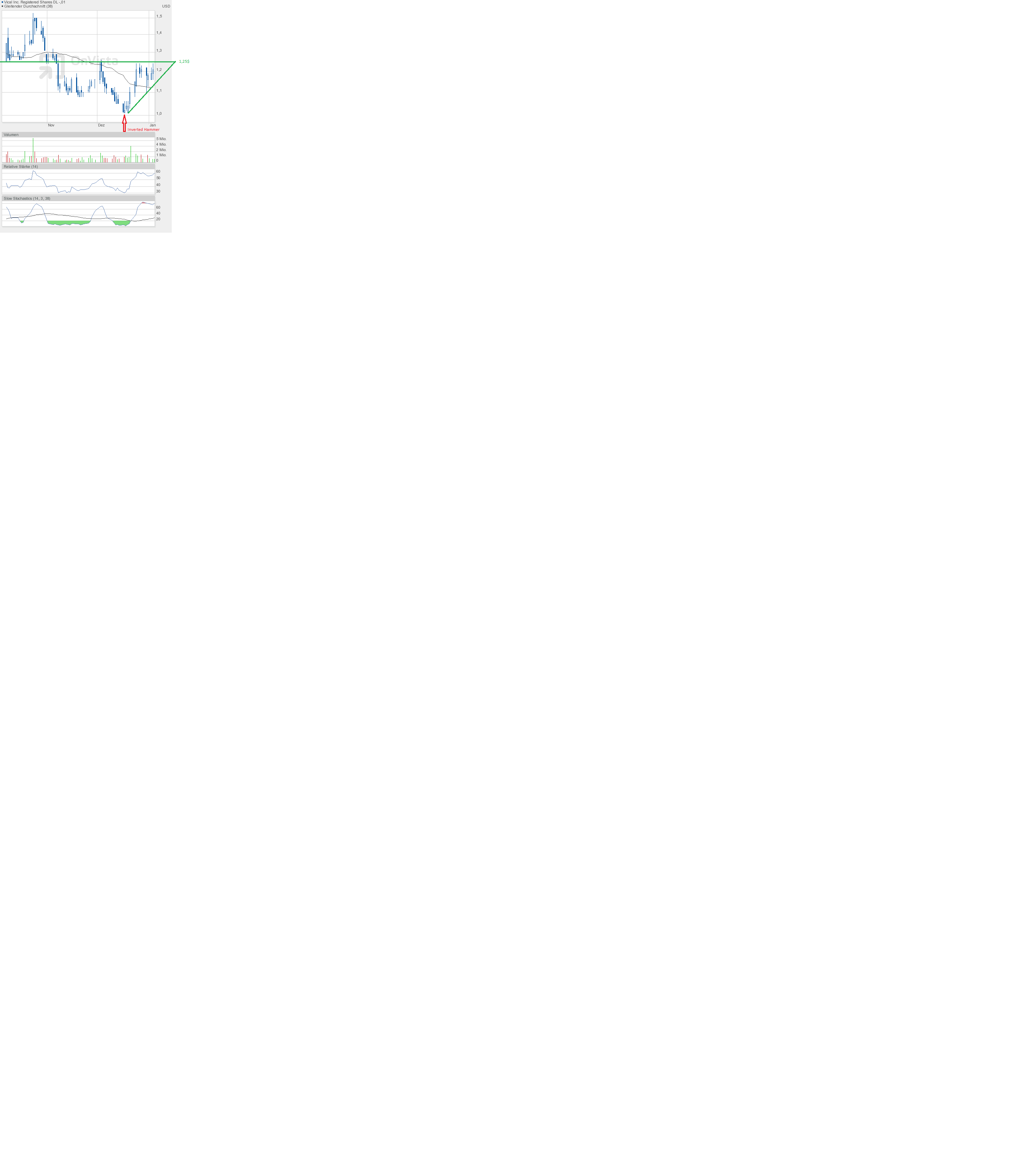 Gestern wurde in den USA bereits gehandelt. Dabei versuchte sich Vical erneut am Widerstand bei 1,25$. Aber ohne Erfolg - noch. Durch den "Inverted Hammer" stellt sich nicht die Frage ob, sondern wann die 1,25$ übersprungen wird. Schließlich handelt es sich um eine nachhaltige Trendwende. Das Anschlussziel bleibt 1,50$.