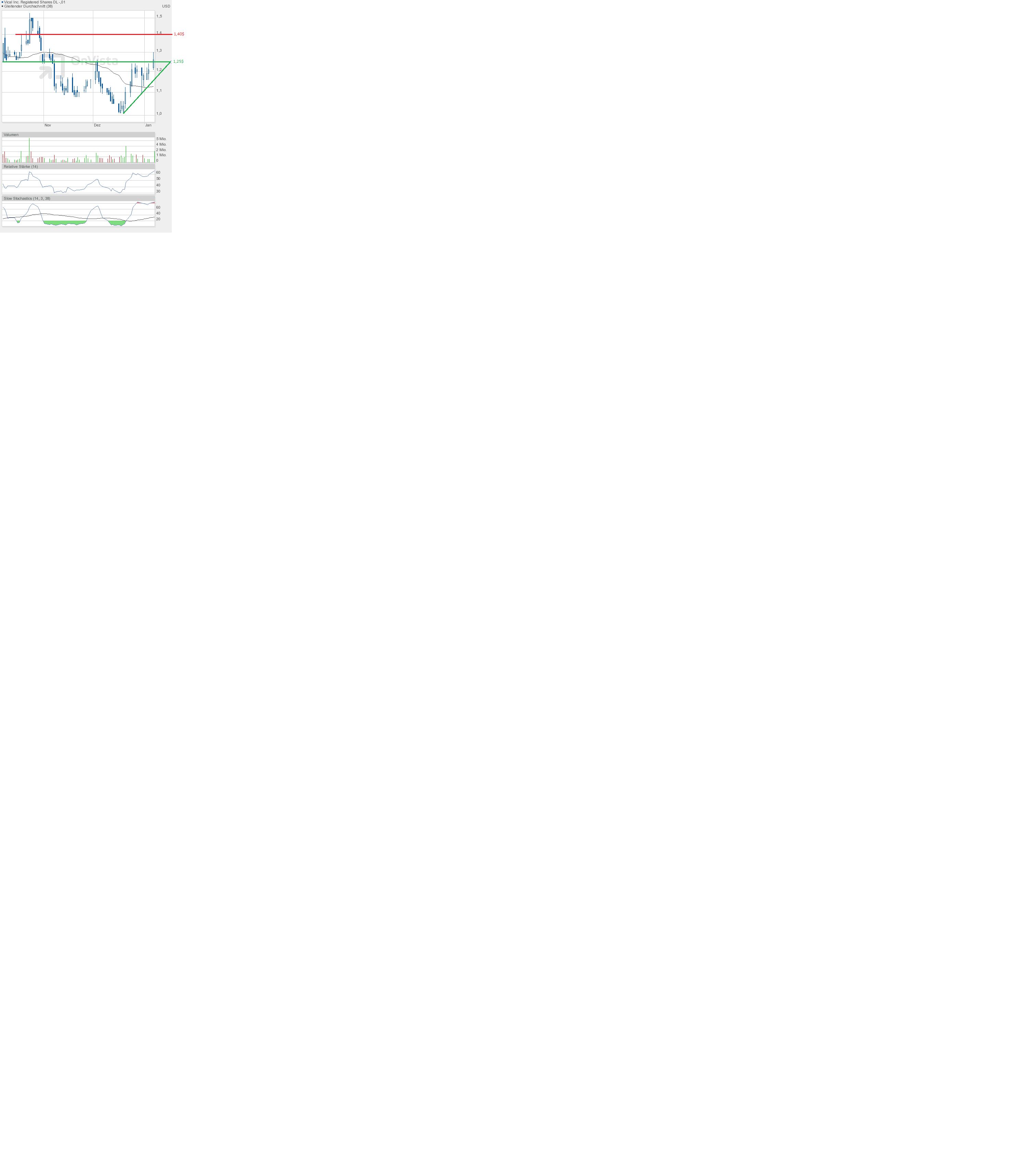 An den Börsen wurde am 1. Handelstag 2014 erst einmal ordentlich Kasse gemacht, deutliche Minuszeichen waren zu sehen. Vical dagegen geht mit einem kleinen Plus heraus, Schlusskurs 1,19$. Das ist schön, aber nicht entscheidend. Vical muss erst über 1,25$ steigen.