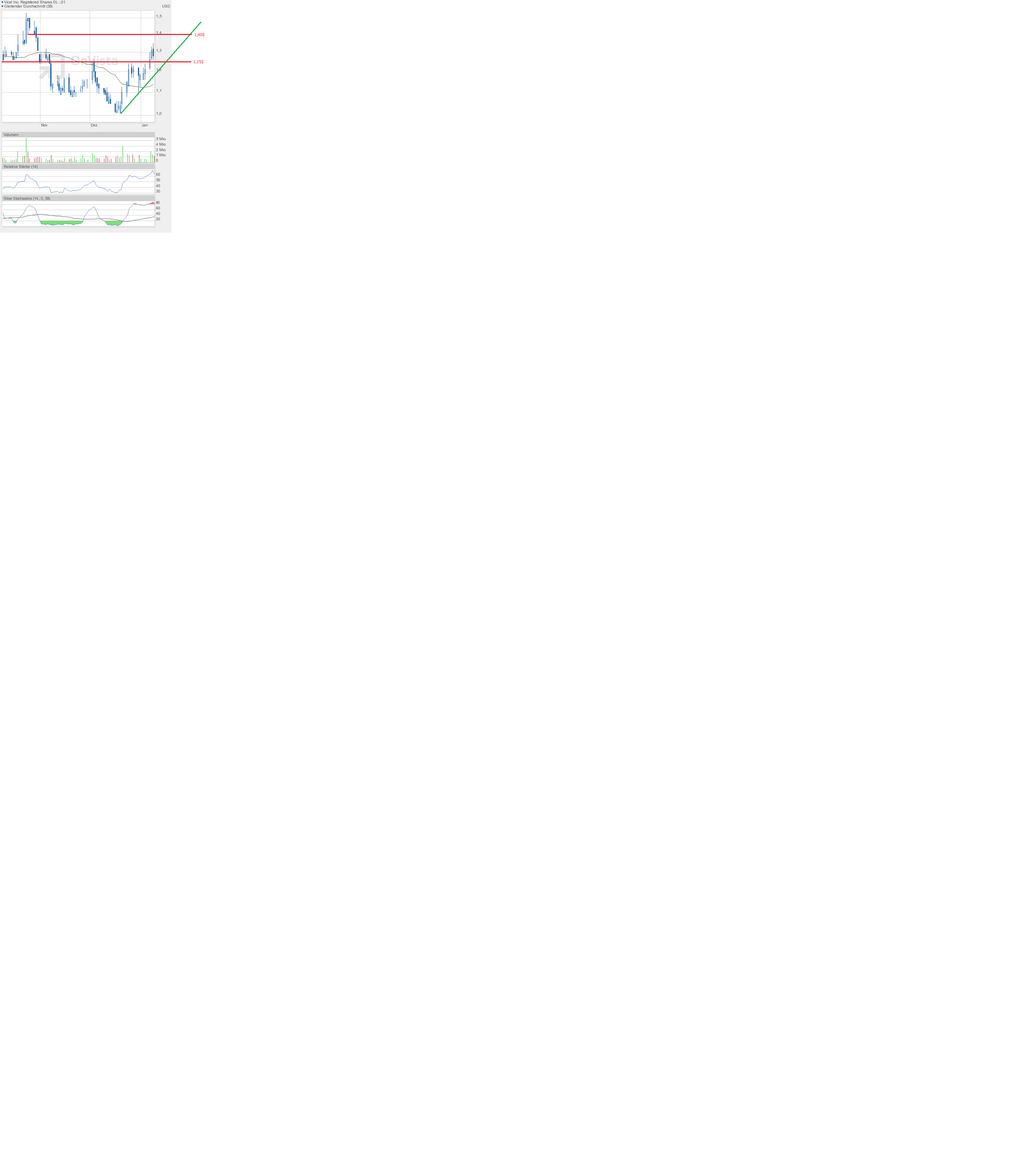 Da ging Vical also mit 1,18$ aus dem Jahr 2013 heraus. Das ist und bleibt in der aktuellen Situation weiter nichts sagend, denn das nächste Kaufsignal wird erst über 1,25$ losgetreten. Die rote Aufwärtstrendlinie konnte zum Jahresende nicht gehalten werden. Damit war der angedachte Sprung über 1,25$ charttechnisch blockiert. Aber es ergibt sich jetzt eine neue Chance auf einen Ausbruch aufgrund des schönen Reversals ab 1,10$ in Form des grünen Keils. Spätestens Ende nächster Woche wissen wir mehr. Ich bleibe auf jeden Fall bei meiner Meinung, dass die 1,25$ überboten werden wird, denn der "Inverted Hammer" hat Gültigkeit.