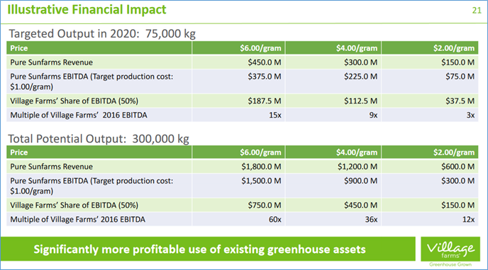Die angepeilten Produktionskosten je Gramm betragen laut Village Farms ca. 1 USD. Andere Unternehmen haben in der Regel höhere Produktionskosten (ca. 1 bis 2 USD).