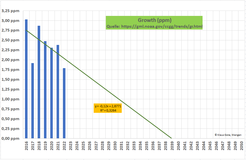 Die lineare Trendlinie­ dieser Daten zeigt dass die Welt ungefähr in 2039 keinen Zuwachs der CO2-Konzen­tration mehr sieht. Voraussetz­ung ist natürlich,­ dass es so weiterläuf­t wie seit 2016.