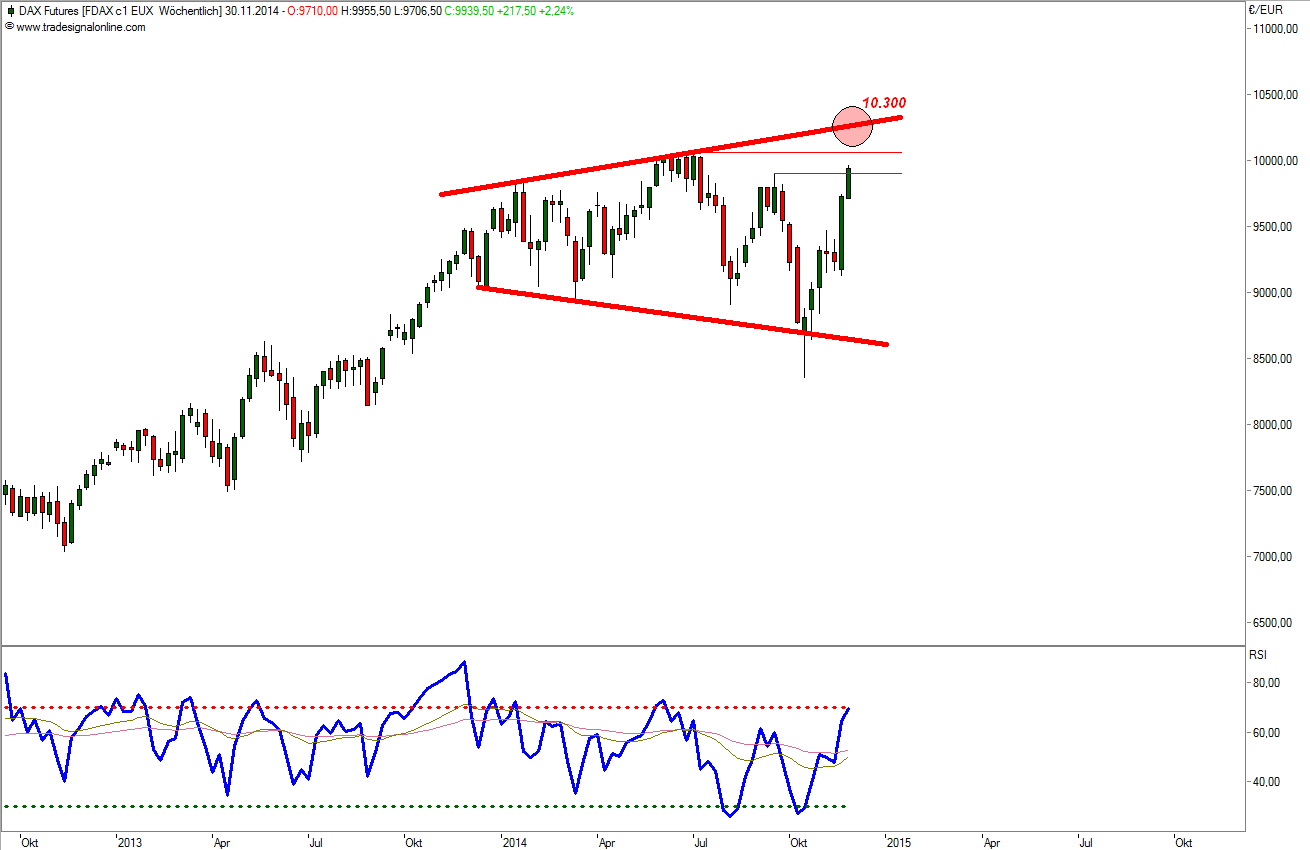 Das Jahresende naht, "windows dressing" beginnt, weil die Fondsgesellschaften performance aufweisen müssen, um in 2015 wieder verkaufen zu können. Die Politik des lockeren Geldes seitens der EZB gibt dazu Schützenhilfe, so kann dem DAX in diesem Jahr eigentlich nichts mehr passieren.