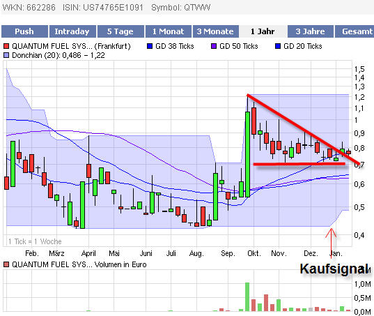 QFS ist relativ gut bei 0,70 € abgesichert. Dieser Bereich wurde mehrfach bestätigt. Ende Dezember 2009 gab es ein Kaufsignal gem. dem Donchian Kanal. Die Abwärsttrendlinie seit Oktober 2009 wurde zwar durchbrochen jedoch mit geringem Umsatz. Hier könnte die Konsolidierung weiterlaufen. Es könnte aber auch weiter über 0.80 € ansteigen. Der nächste Impuls sollte die Aktie bis auf 1,80 € führen. Dort sollte wieder eine Konsoliduerung eintreten.