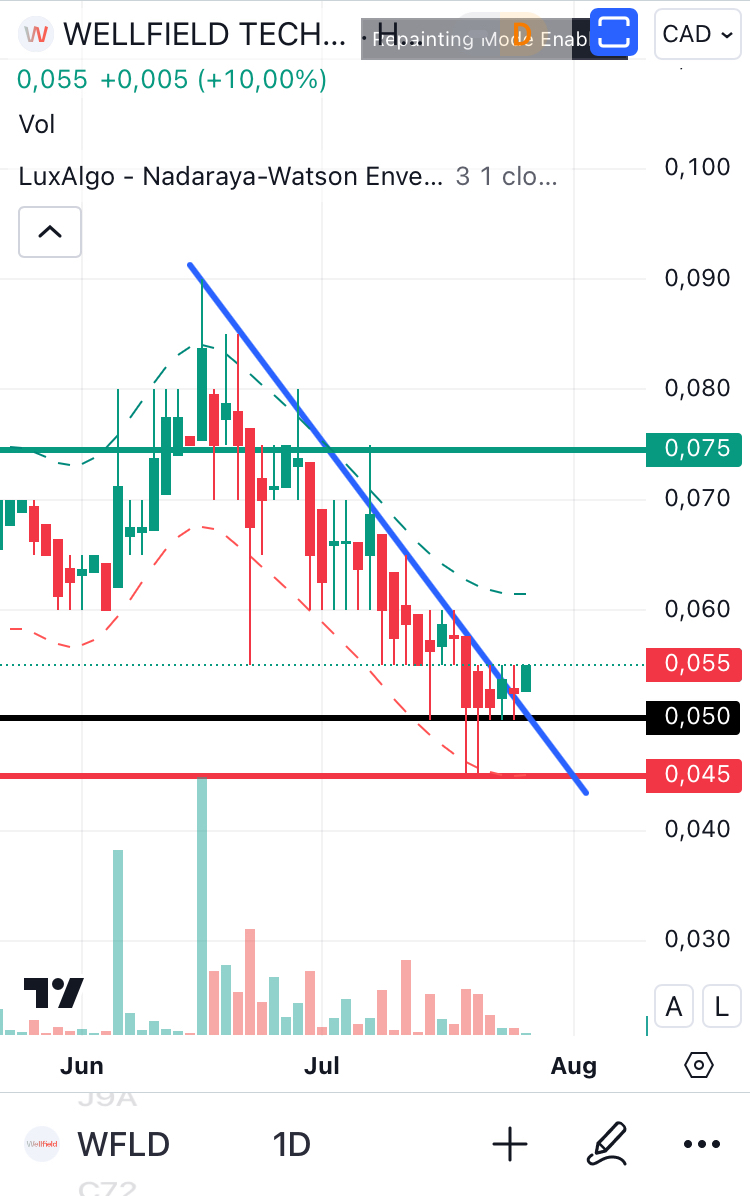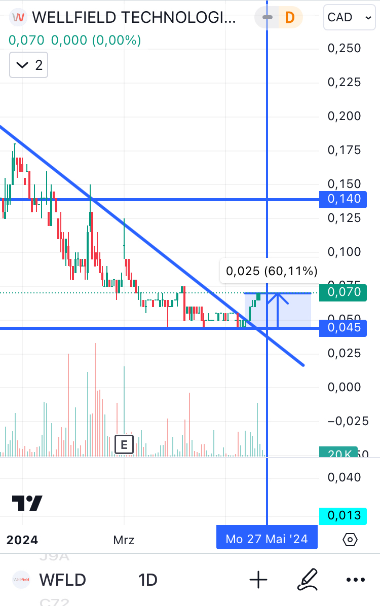 Ich habe die Kursverluste zum Nachkaufen genutzt und meinen Durchschnittskaufpreis auf aktuell 0,24 CAD gesenkt. Das Tief bei 0,06 CAD könnte einen Wendepunkt markieren, sofern Käufe die Verkäufe überwiegen. Charttechnisch warte ich auf den Ausbruch aus der fallenden Dreiecksformation. Längeres Verharren unter 0,06 CAD wäre ein Warnsignal für mich.